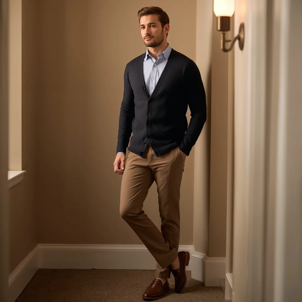 Choose a slim-fit cardigan in a neutral color – grey, navy, or camel work brilliantly. Layer it over a white or light blue Oxford shirt, leaving the cardigan unbuttoned for a relaxed vibe. Dark jeans or chinos complete the look.