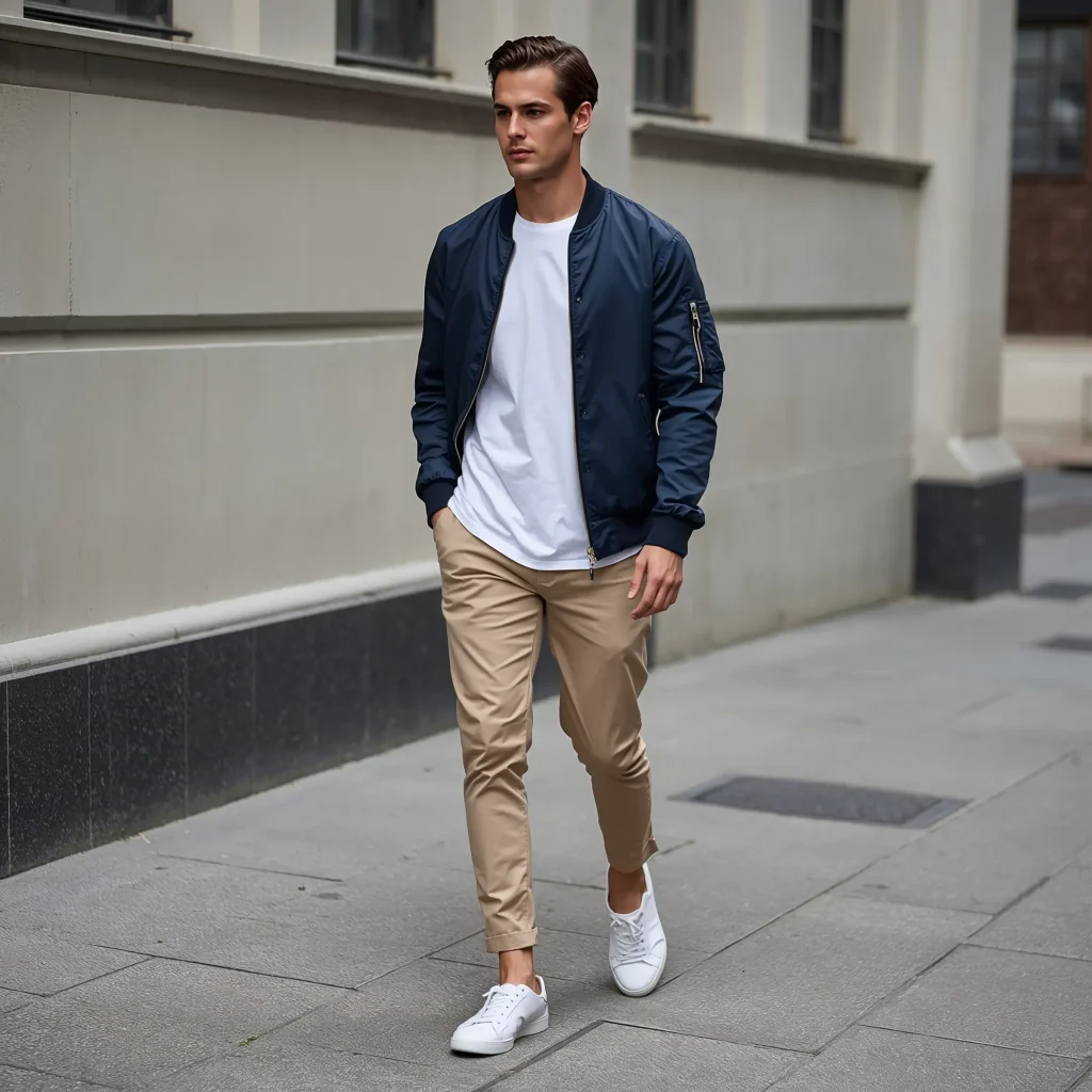 The bomber jacket isn’t just for Top Gun cosplay anymore. A lightweight bomber in a neutral color paired with chinos creates this modern, stylish look that works in most business casual environments.