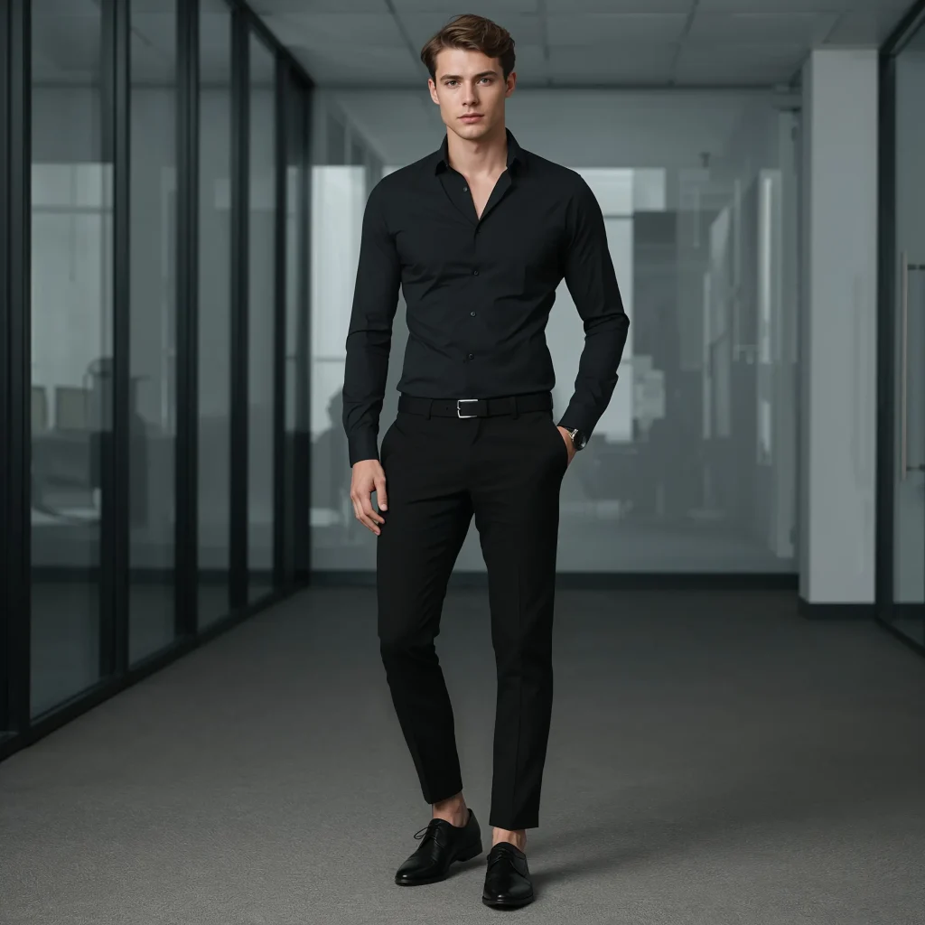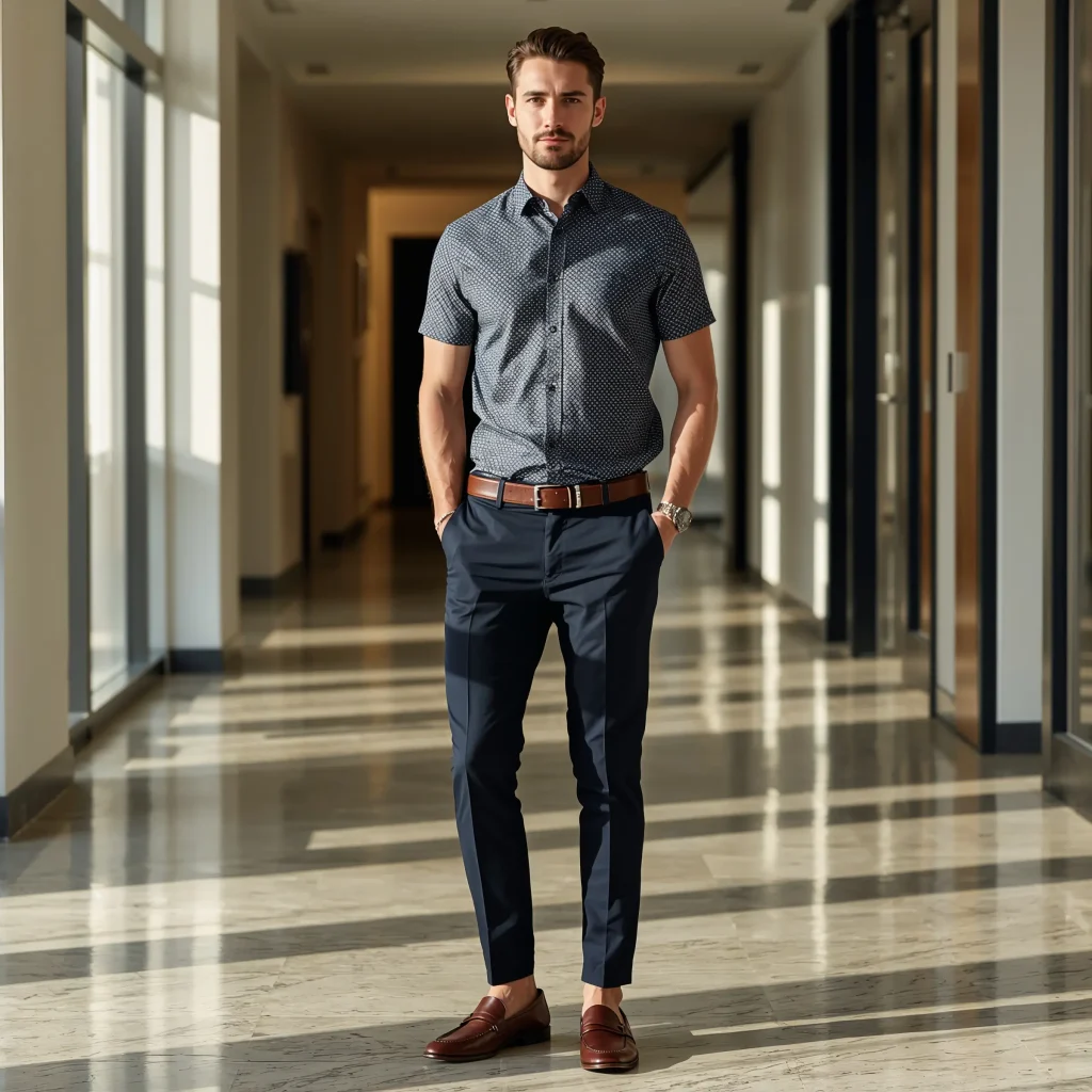 Look for shirts with interesting patterns or textures – tropical prints for casual Fridays, subtle patterns for regular office days. Pair with slim-fit dress pants and leather loafers or minimalist sneakers. This outfit is perfect for warm weather when long sleeves feel like torture devices.