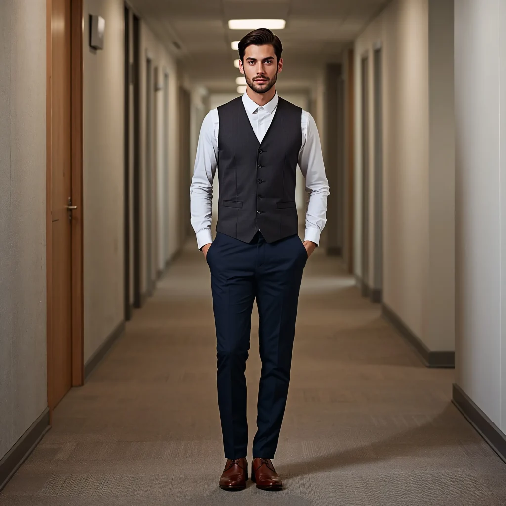 Choose a vest in a complementary color to your shirt – grey vest over white shirt, navy over light blue. Pair with matching or coordinating trousers. The key is ensuring the vest fits properly – snug but not tight, hitting right at your belt line.