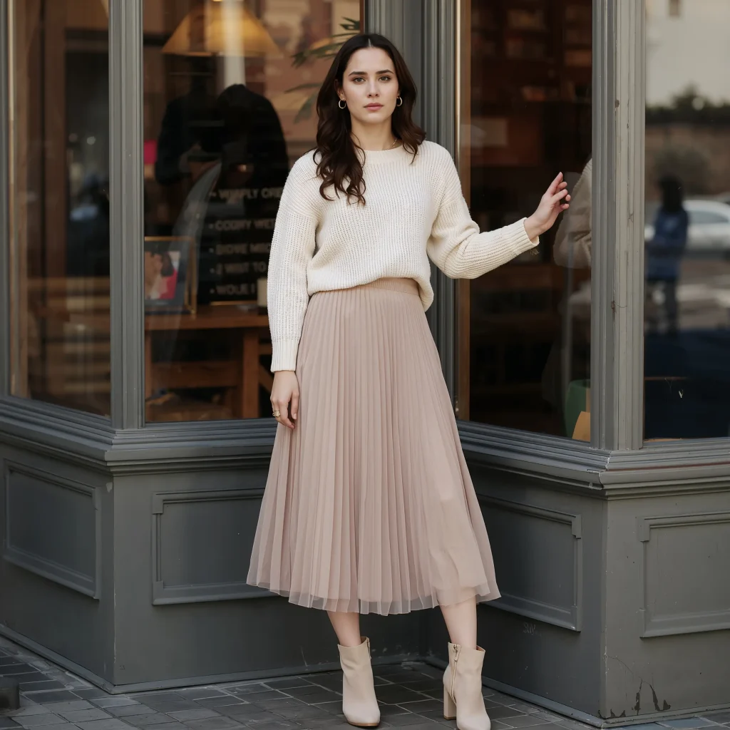 I usually go for a chunky knit sweater (slightly oversized but not sloppy) with a flowy midi skirt. The contrast between the cozy top and feminine bottom creates this effortlessly elegant vibe.