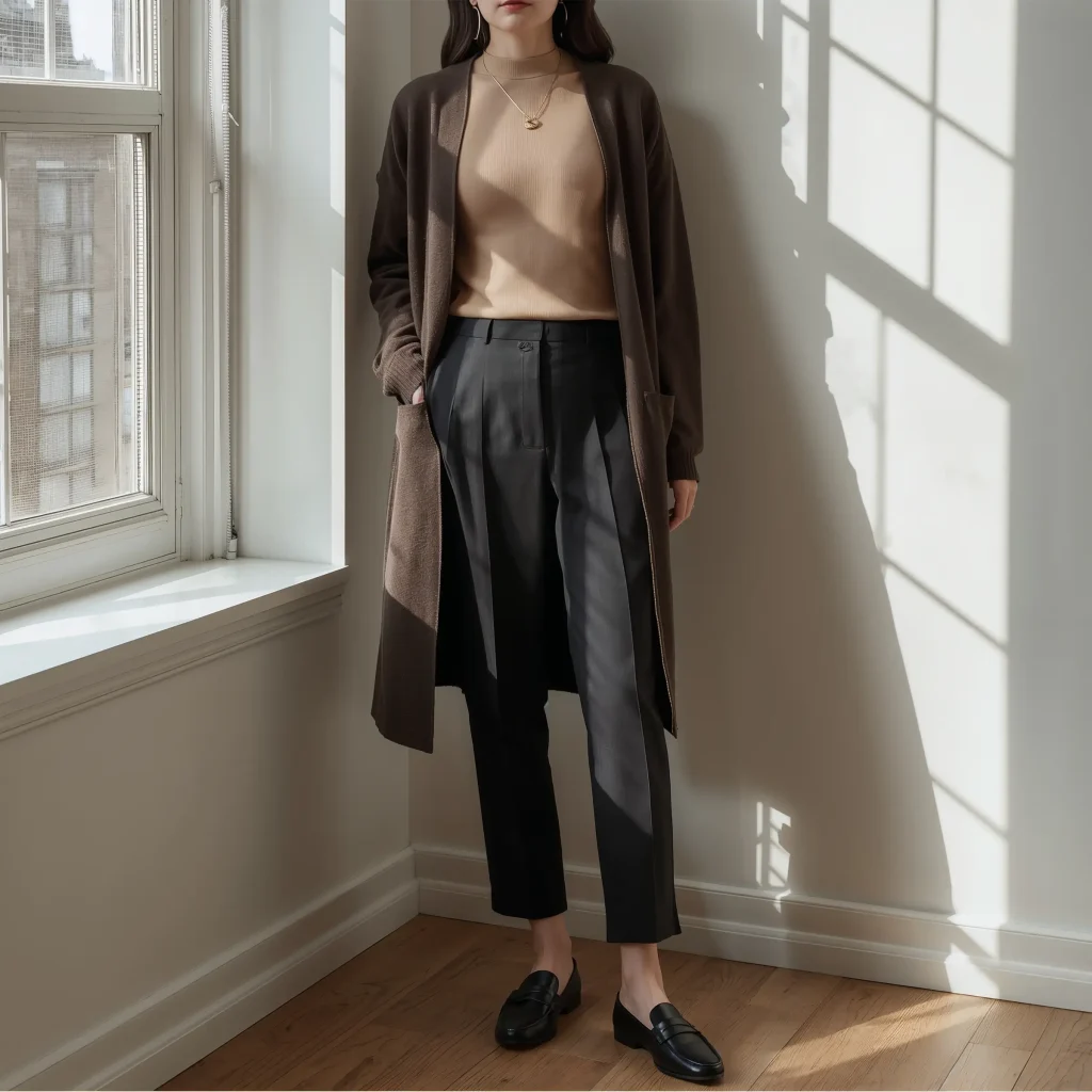 My go-to formula involves a fitted tank or camisole, high-waisted trousers, and a cropped cardigan worn open. It creates this relaxed yet intentional look that works for everything from client meetings to coffee runs.