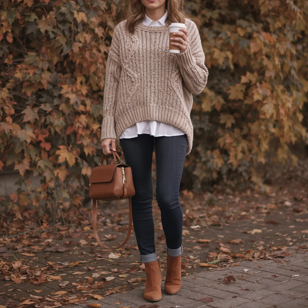 My go-to formula? Start with a basic fitted tee or tank, add a button-down shirt (leave it slightly unbuttoned for that relaxed feel), then throw on a chunky knit sweater. The collar and cuffs peeking out add instant polish. It’s like wearing a costume that says “I read books and drink artisanal coffee.”