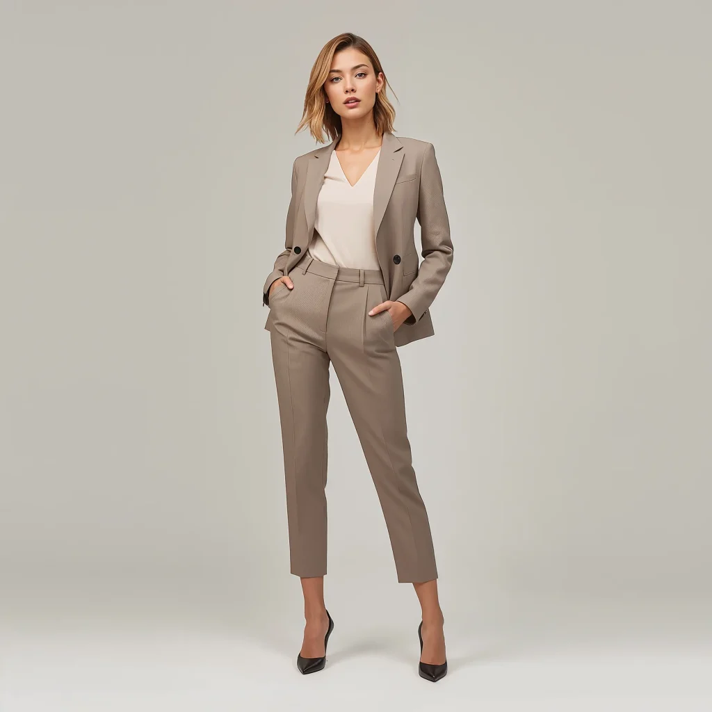 Start with a crisp white button-down – but not your dad’s oversized one. I’m talking about a fitted, quality cotton shirt that you tuck into high-waisted trousers. Add pointed-toe flats or low heels in a neutral shade, and you’ve got yourself an outfit that screams “I run meetings and take names.”