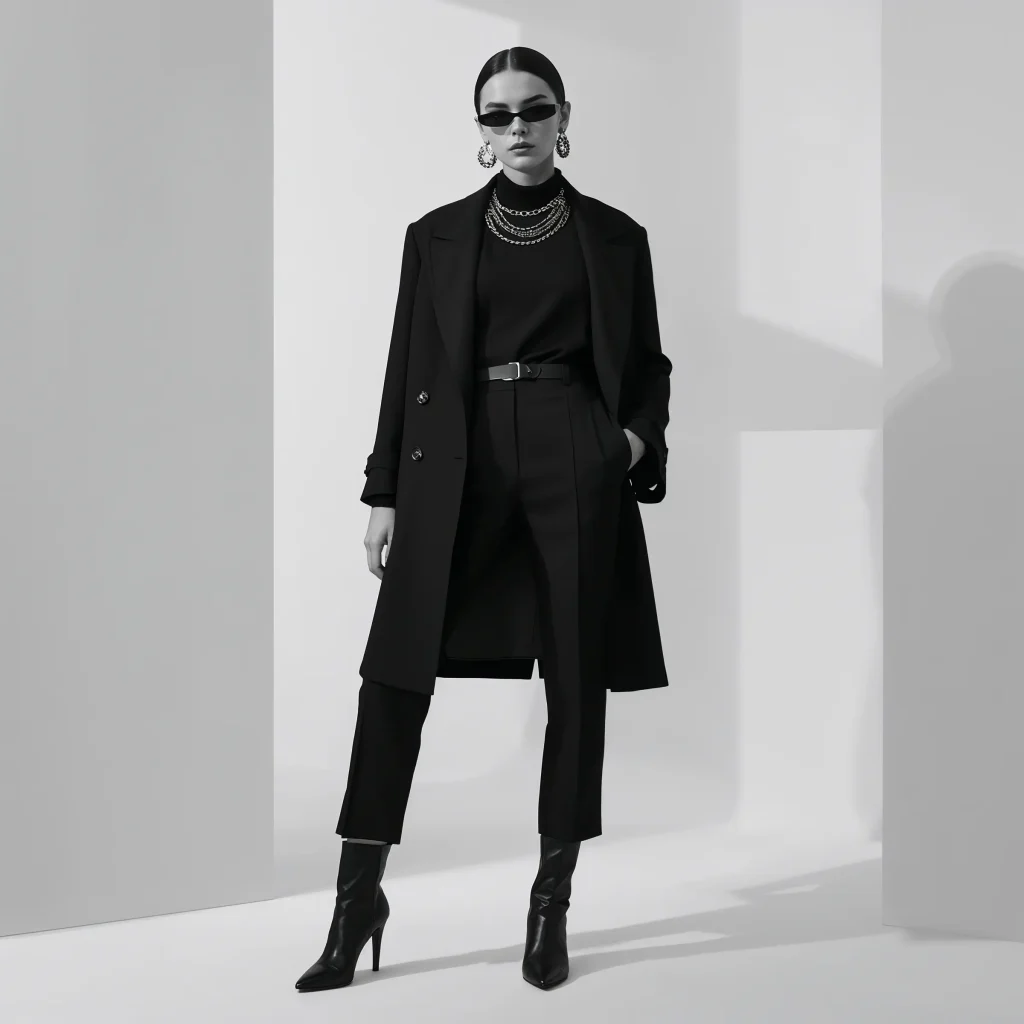 The secret sauce? Different shades and finishes of black. Mix matte with shine, structured with flowing. Your outfit suddenly has depth and interest without any color at all.