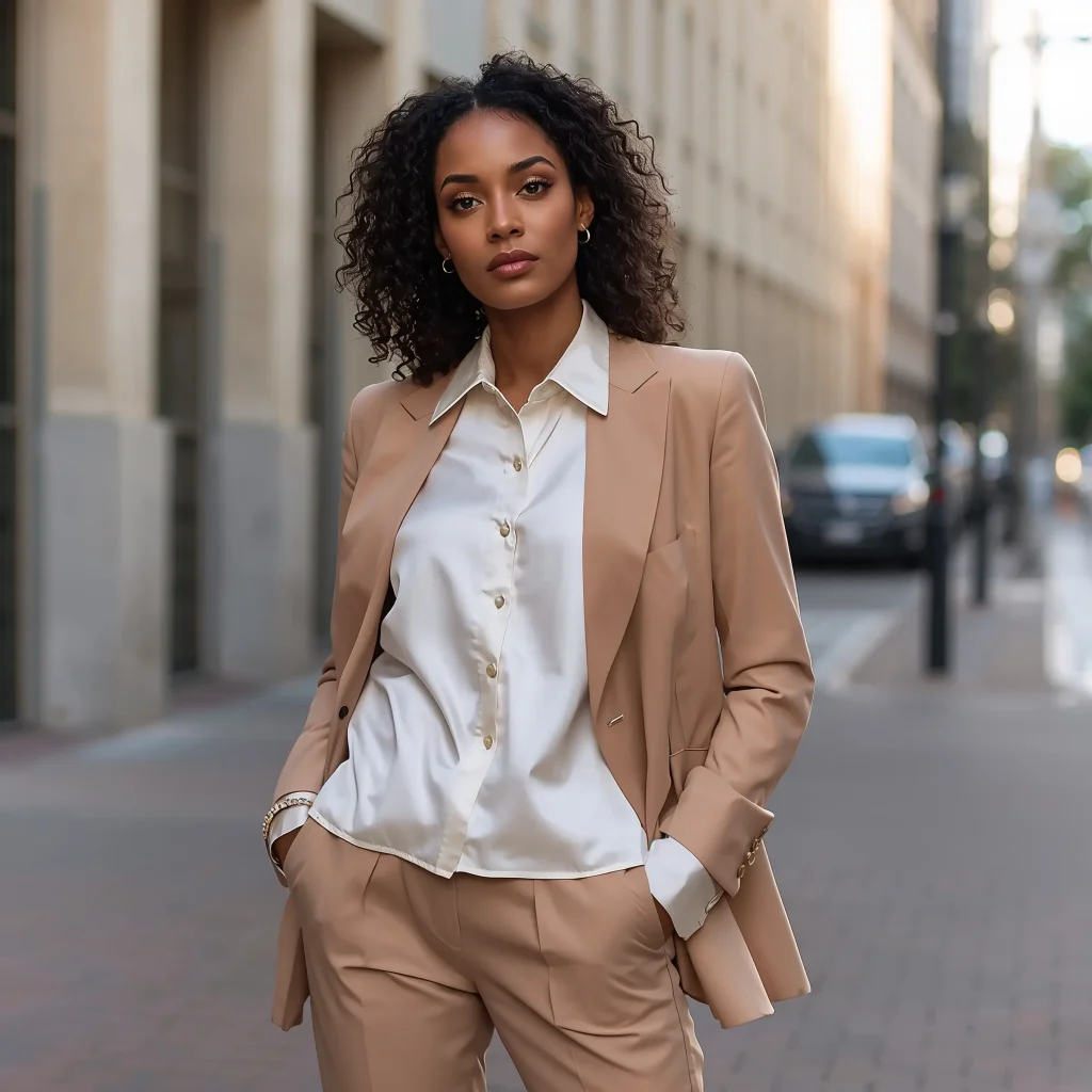 Pair your blazer with high-waisted trousers in a complementary neutral tone. The key here? Make sure those pants fit like they were made for you. Add a silk camisole underneath in cream or champagne – something that catches the light just right when you move.