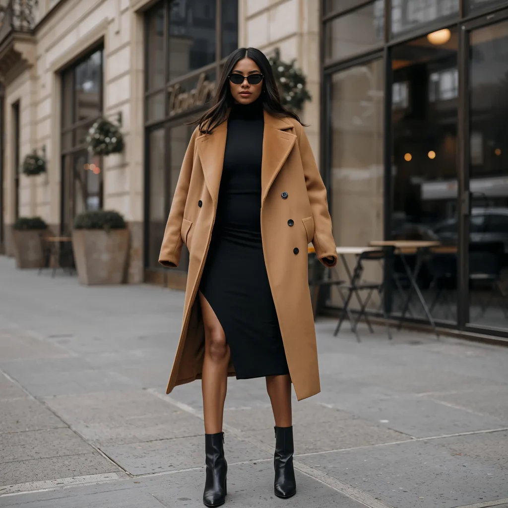 The power of a good coat cannot be overstated. A luxurious camel coat instantly elevates any outfit, but over a bodycon dress? That’s next-level styling. Choose a fitted dress in a rich color or classic black.
