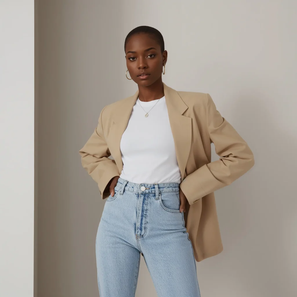 Let’s start with a classic that never goes out of style. A perfectly tailored neutral blazer changes everything about your silhouette. I’m talking about those gorgeous beige, camel, or soft gray pieces that work with literally everything in your closet.