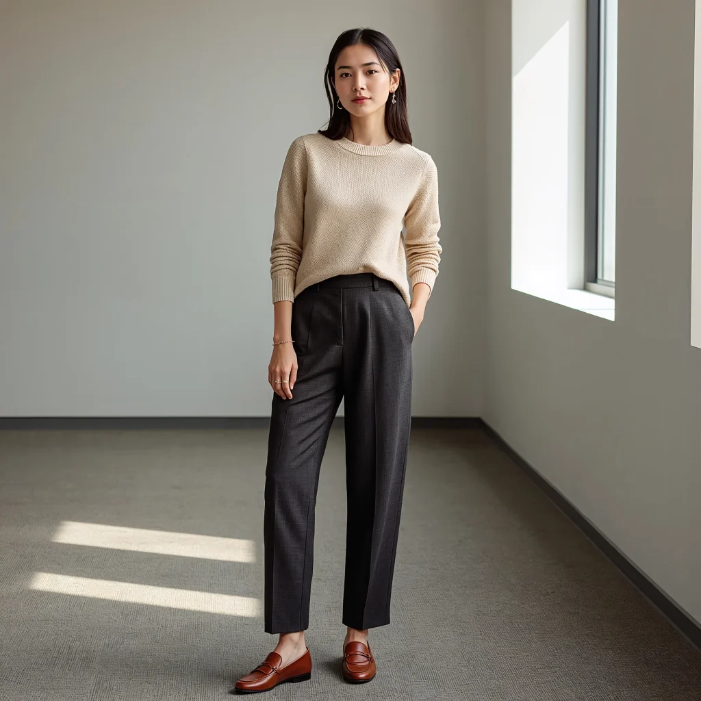 I typically go for neutral colors like camel, grey, or navy for the sweater. They pair beautifully with charcoal or black tailored pants. The magic happens when you nail the fit – your pants should skim your body without clinging, and the sweater should hit right at your hip bone.