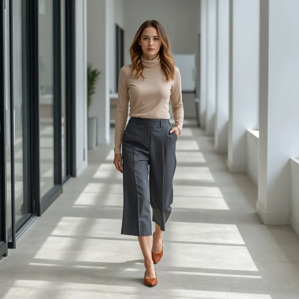 This outfit shines in transitional weather. The turtleneck keeps you warm in air conditioning, while the culottes prevent overheating. Add some sleek ankle boots or pointed flats to complete the look. IMO, this combo makes everyone look taller and more sophisticated.