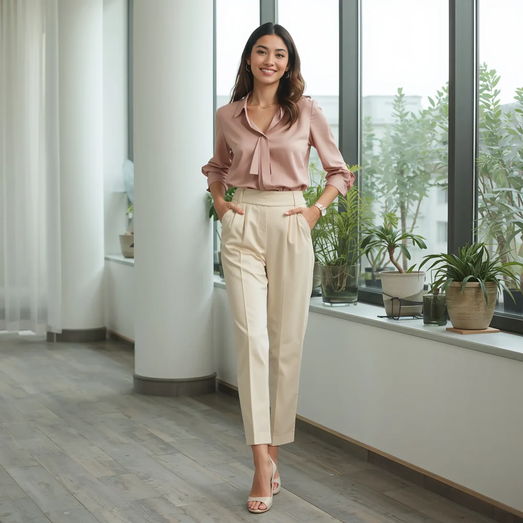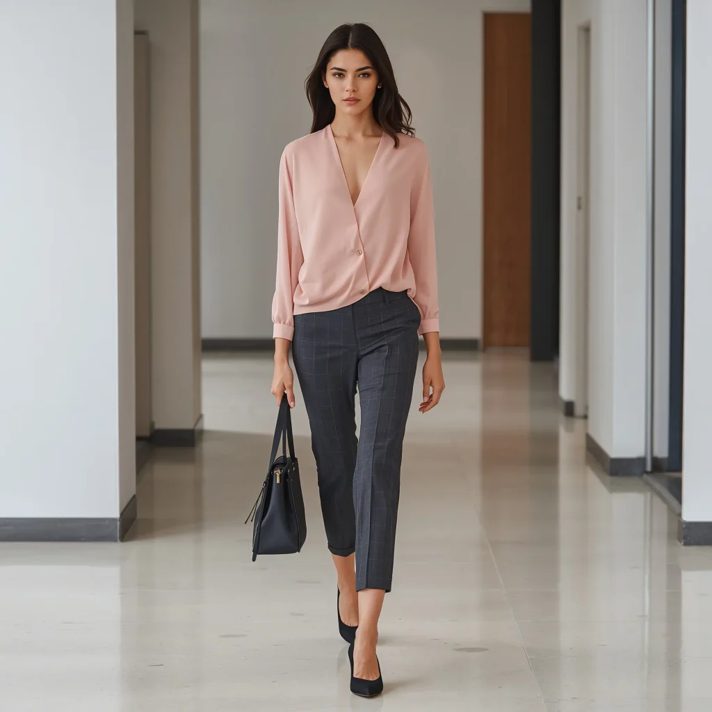Color-wise, you can’t go wrong with classic combinations. Think ivory blouse with navy trousers, or a dusty pink top with grey pants. The contrast between the structured bottom and fluid top creates visual interest without trying too hard.