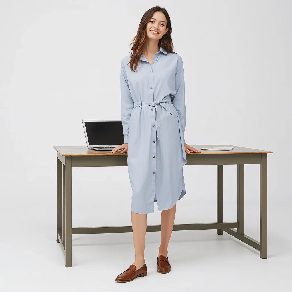 The beauty of this combination lies in its versatility. Throw on a blazer when you need extra authority, or add a cardigan for cozy vibes. The shirt dress handles all seasons too – bare legs in summer, tights in winter, and you’re sorted.