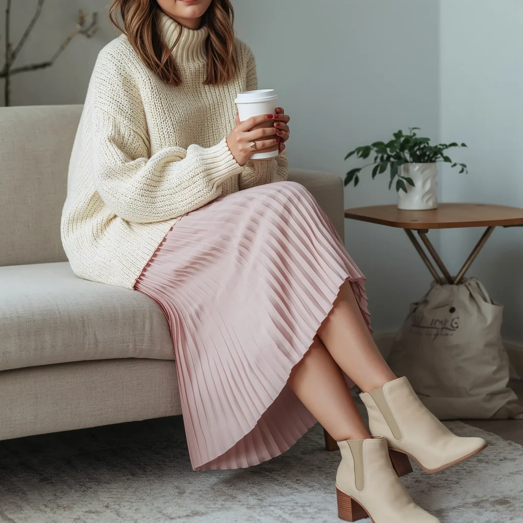 I usually do a half-tuck with the sweater, just tucking in the front portion to show the waistband of the skirt. This creates a more defined silhouette while maintaining that relaxed vibe. Pleated midi skirts work particularly well here, adding movement and interest.