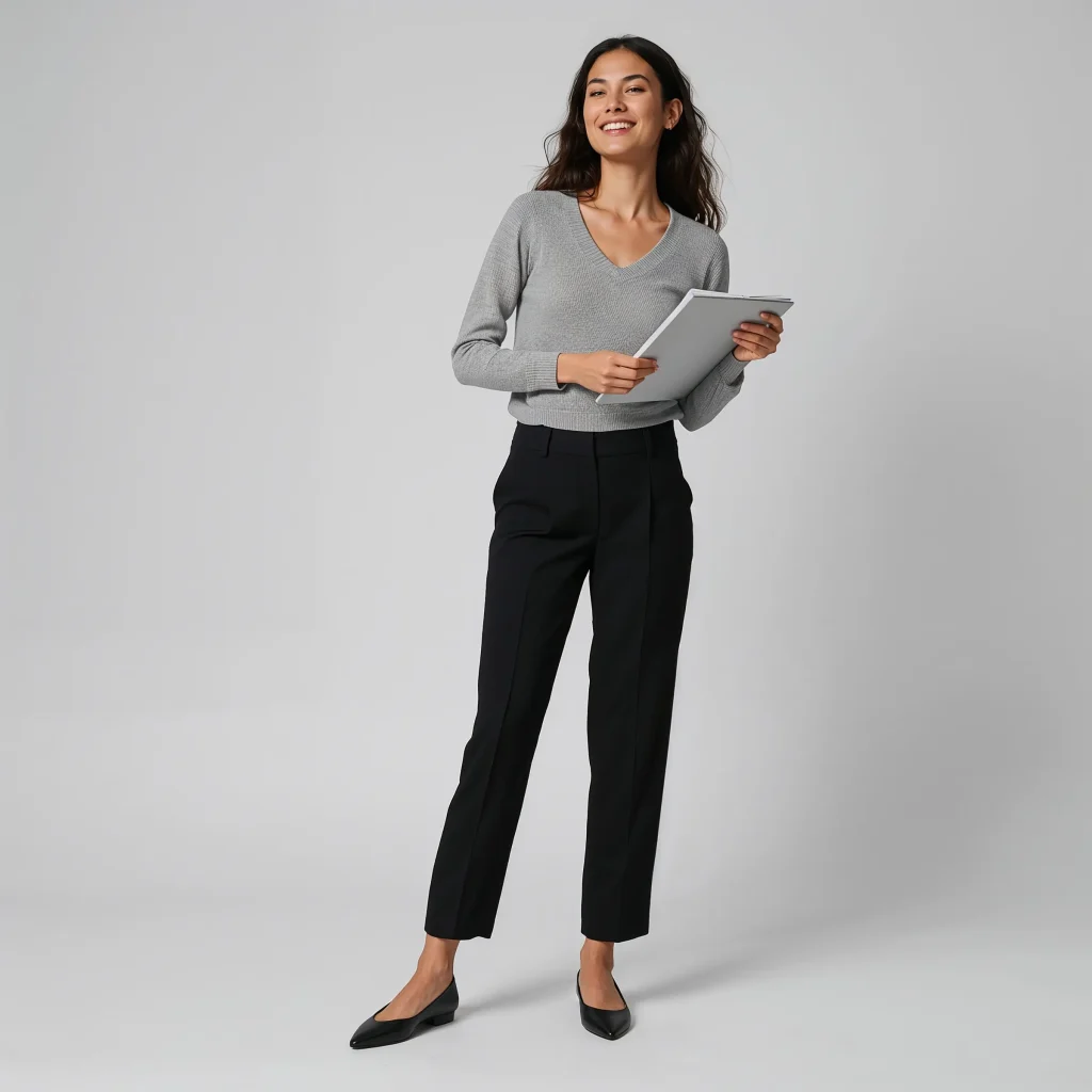 Remember, these aren’t rigid rules – they’re starting points. Mix and match elements from different outfits to create your own signature looks. Maybe you’ll pair that cozy knit sweater with culottes, or try the draped top with your favorite stretch jeans. The goal is finding what makes you feel like the best version of your professional self.