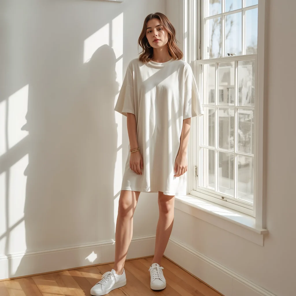 The beauty of t-shirt dresses lies in their versatility. Wear them alone when it’s warm, layer them over leggings when it’s not. Add a denim jacket for structure, or throw on an oversized cardigan for maximum cozy vibes.