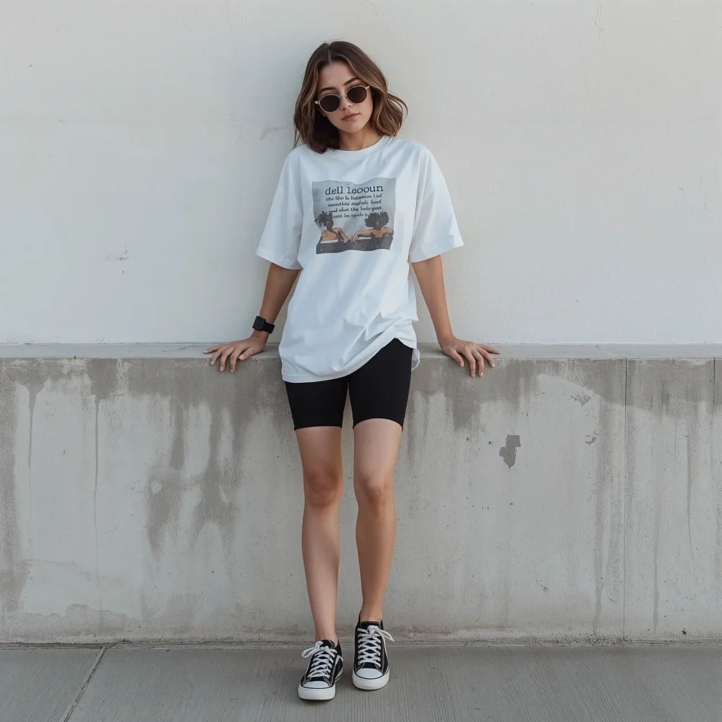 The oversized tee should hit mid-thigh for the best proportions with bike shorts. Any shorter and it looks like a regular outfit; any longer and you can’t see the shorts at all (defeating the purpose).