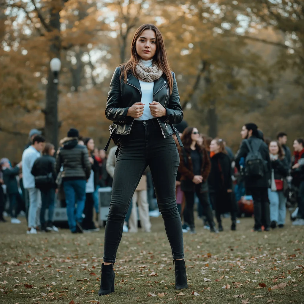 Let’s kick things off with the ultimate fall concert staple – the leather jacket. This isn’t just any outfit; it’s THE outfit that screams “I know what I’m doing.”