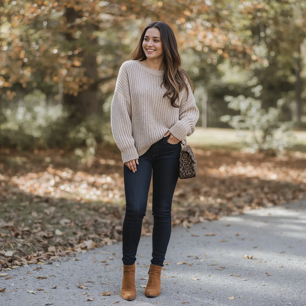 Sometimes the simplest outfits make the biggest statement. An oversized chunky knit sweater paired with skinny jeans creates that perfect “I’m cozy but cute” aesthetic.
