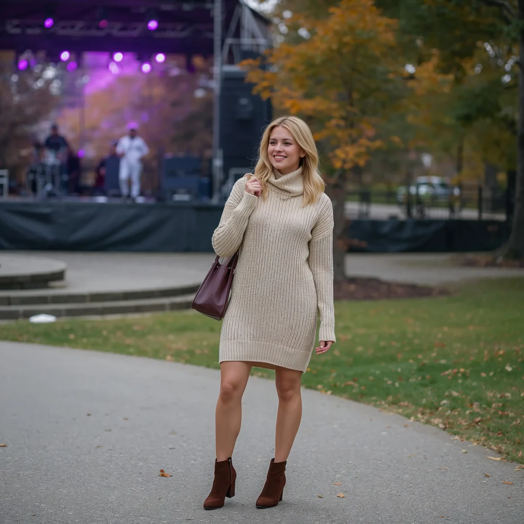 A sweater dress might not be your first thought for a concert, but hear me out. This combination offers maximum comfort while still looking intentional.