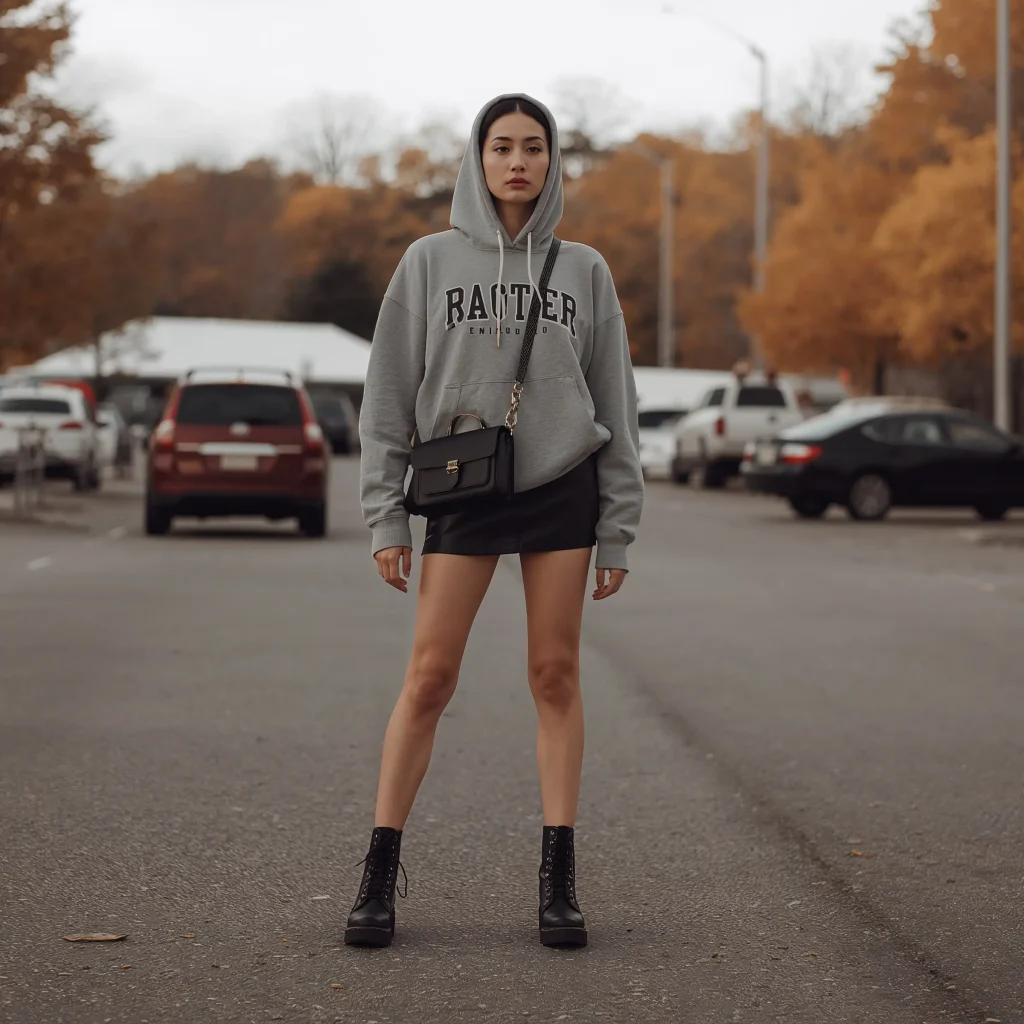 This combo shouldn’t work, but somehow it absolutely does. An oversized hoodie paired with a mini skirt creates that perfect high-low balance.
