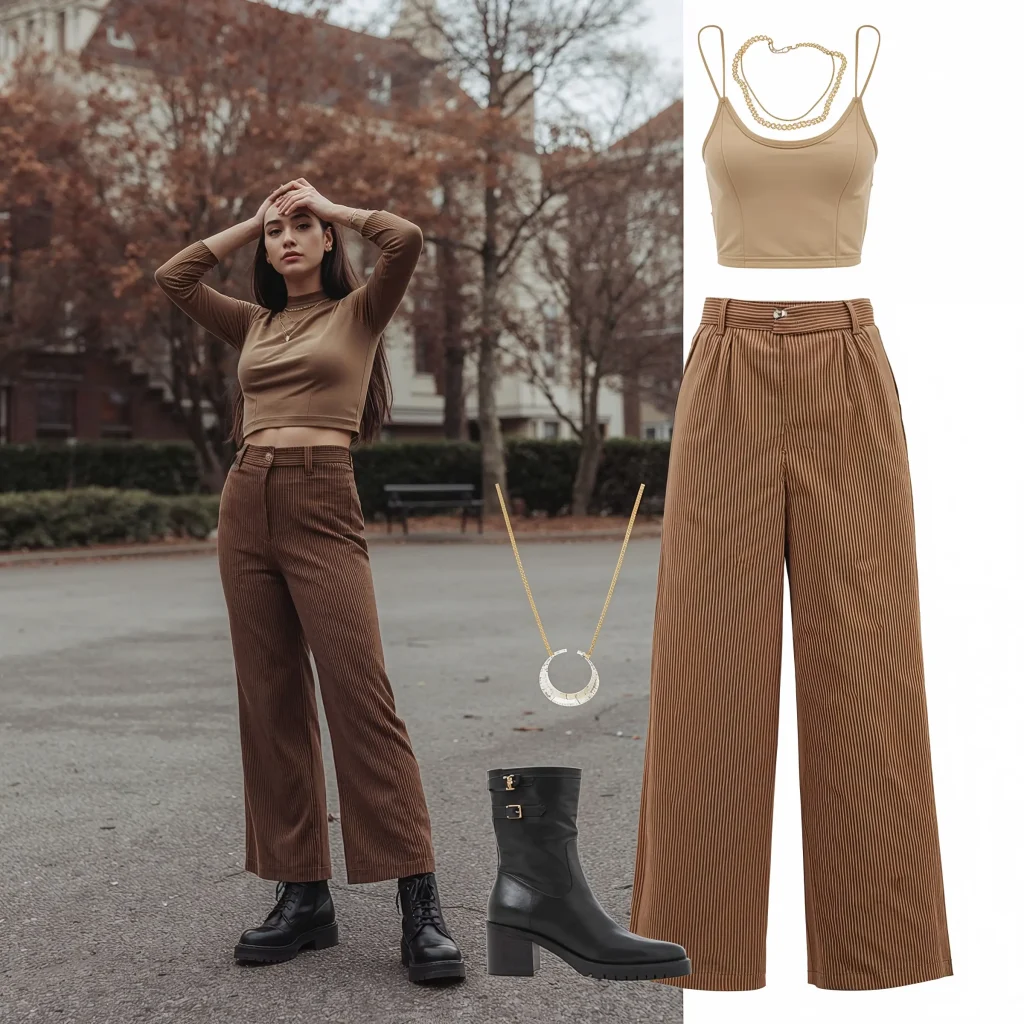 Mix textures by choosing a silky or pleated skirt to contrast with the corduroy’s ridged texture. Add a fitted tee or bodysuit underneath, and finish with boots that hit just below where your skirt ends. The proportions here are everything.