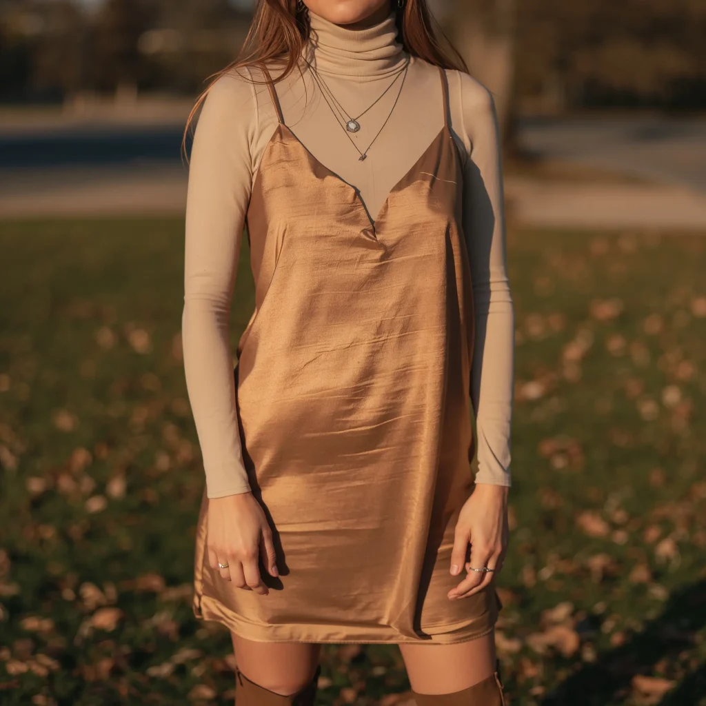 Remember when everyone thought slip dresses were strictly summer? We’ve evolved, people. A silk or satin slip dress over a fitted turtleneck creates this incredibly chic fall look.