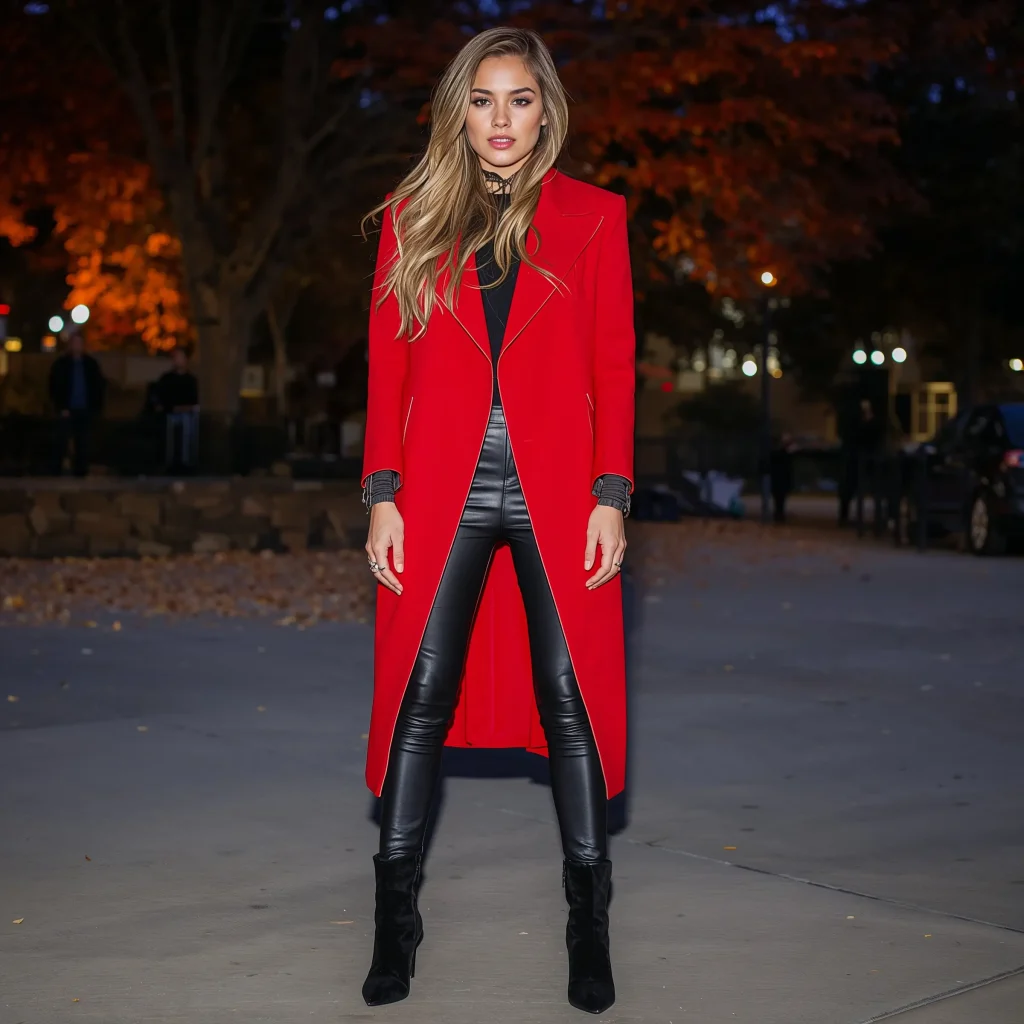 Sometimes your outerwear IS the outfit. A bold statement coat becomes the star when paired with sleek leather leggings.