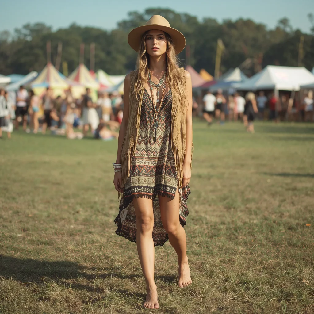Channel your inner free spirit with bohemian festival fashion that flows as freely as the music. Maxi dresses or flowy pants paired with crop tops create that effortless boho silhouette. Fringe details, whether on bags, jackets, or boots, add movement to your outfit.