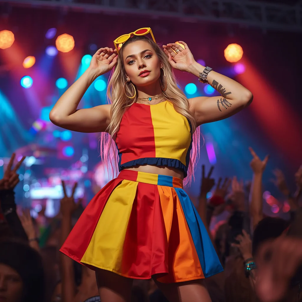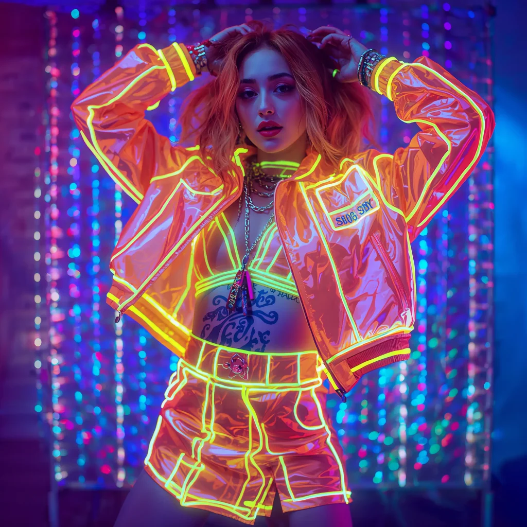 Ready to glow harder than the stage lights? Neon outfits guarantee you’ll stand out in every crowd shot. Neon crop tops or sports bras paired with black bottoms create high contrast that pops. UV-reactive clothing takes things next level at electronic or pop concerts.