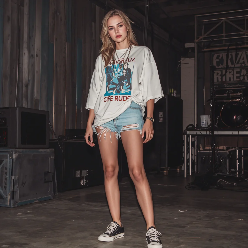 Knot your tee at the waist or tuck it in for different silhouettes. Layer under slip dresses or over mesh tops for unexpected combinations. Distressed denim and beat-up Converse complete this timeless concert look.