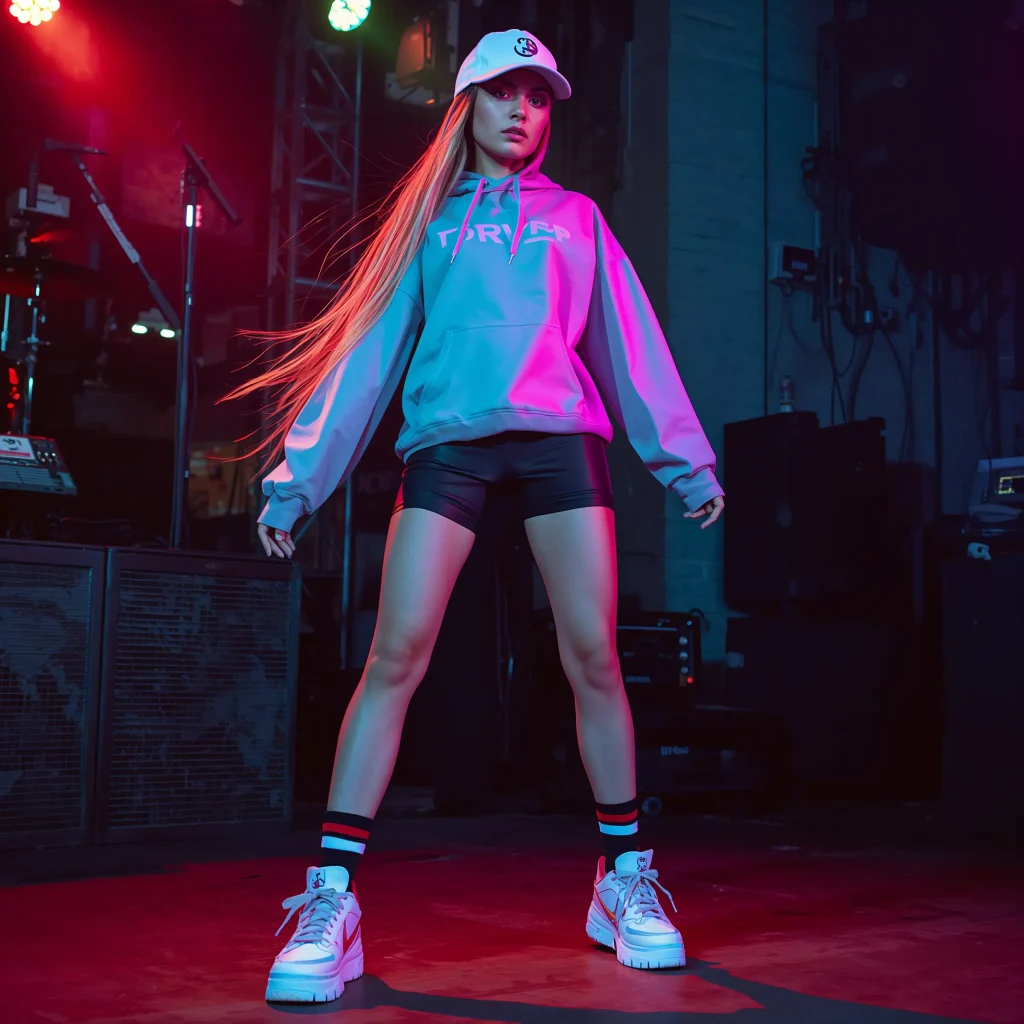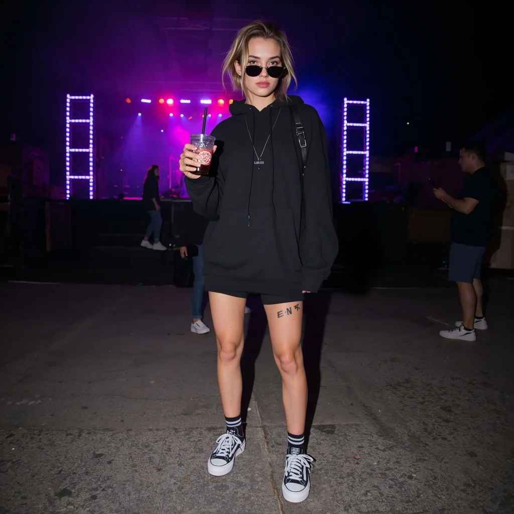 Let’s be real – sometimes comfort wins everything. Oversized hoodies paired with bike shorts or leggings create the ultimate cozy concert look. This style says “I’m here for the music, not the fashion show” and honestly? Respect.