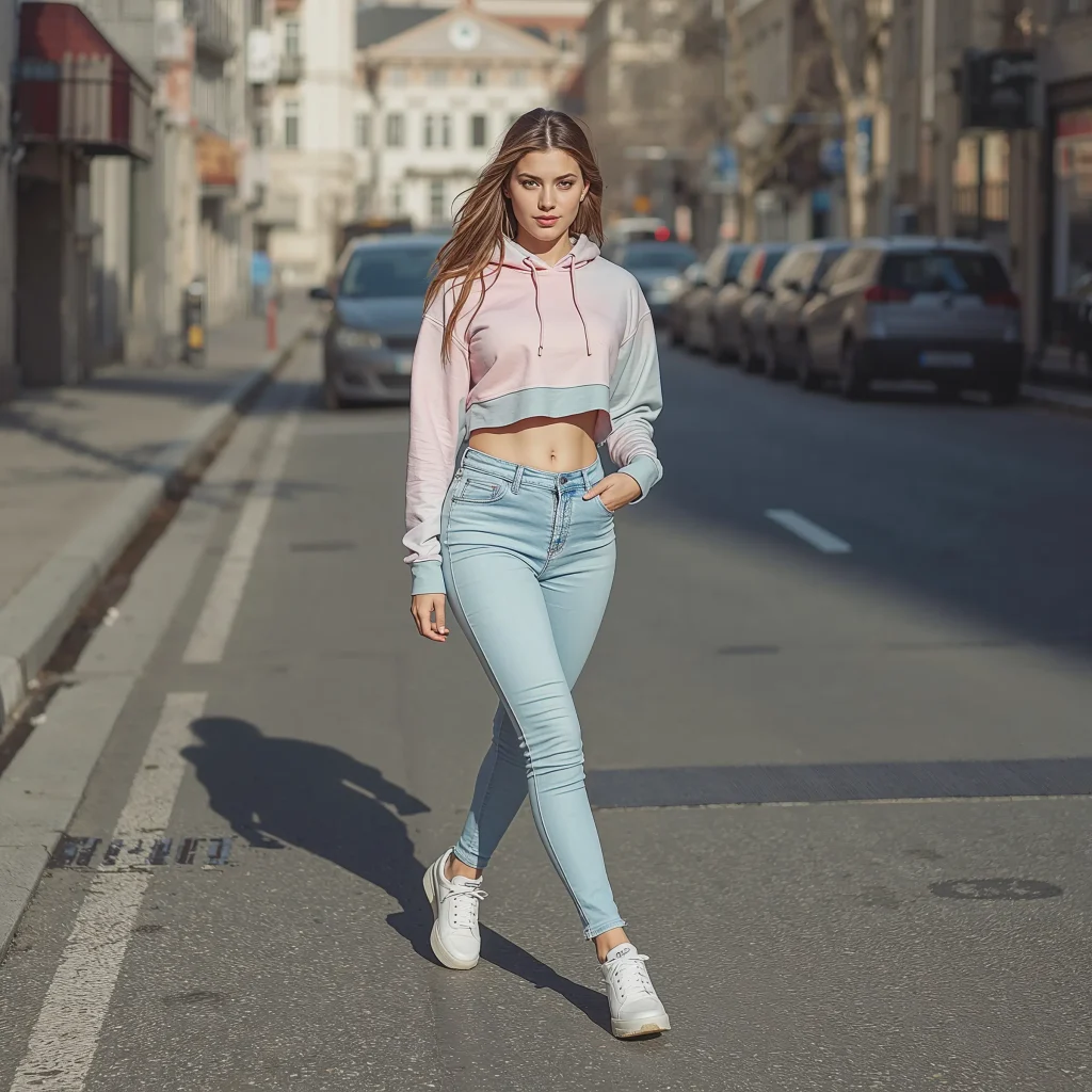 Start with high-waisted straight-leg or mom jeans – these are your best friends when wearing cropped hoodies. The high waist meets perfectly where the hoodie ends, creating that balanced silhouette without showing too much skin. Trust me, this proportion game changes everything.