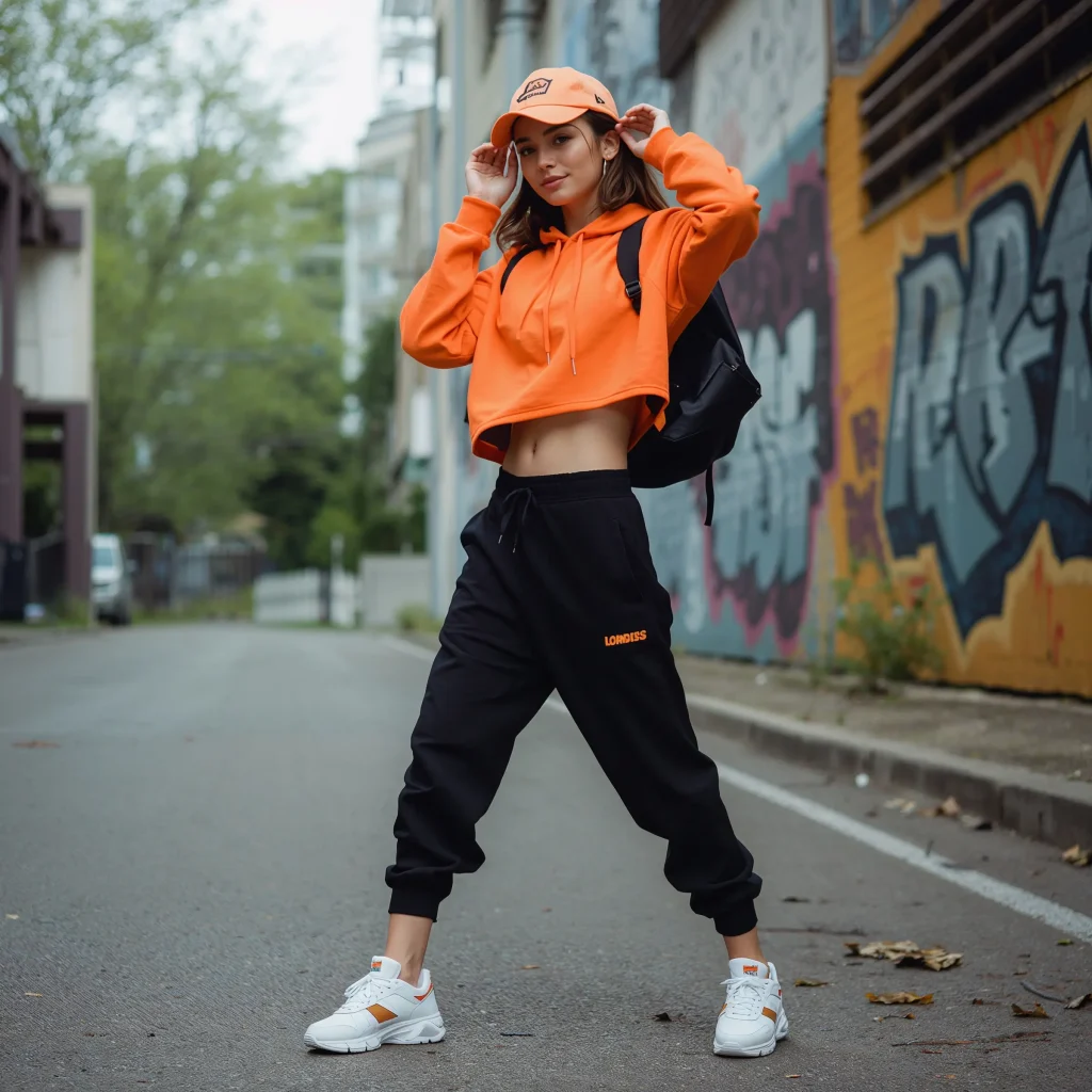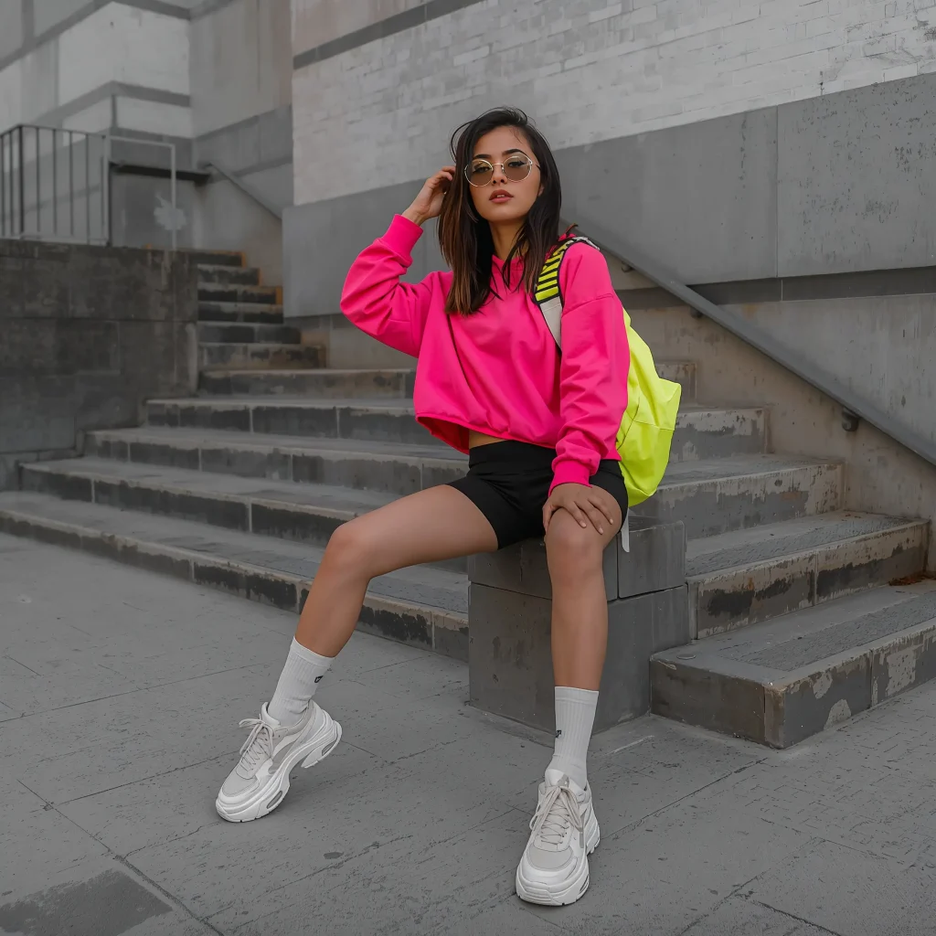 I personally love pairing a bright-colored cropped hoodie with black athletic bottoms. The pop of color keeps things interesting while the black grounds the outfit. Oversized hoodies work especially well here – that slightly baggy fit contrasted with fitted bottoms creates the perfect athletic silhouette.