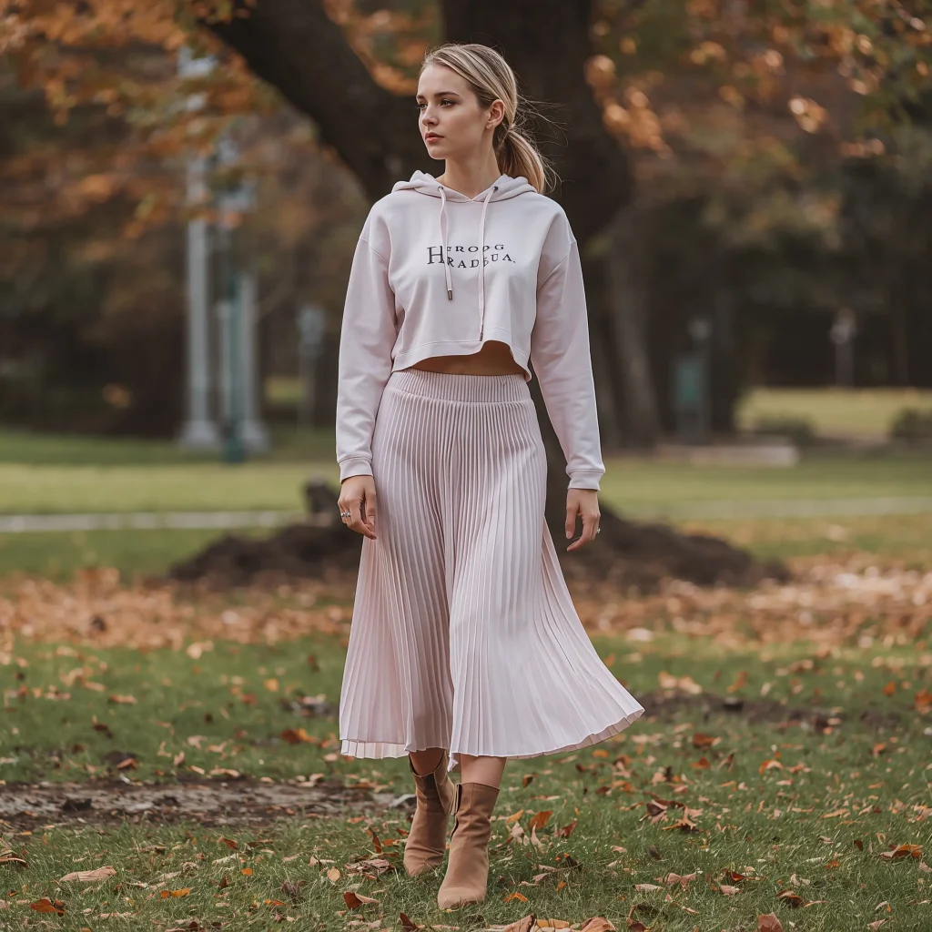 I’m obsessed with pairing a plain white cropped hoodie with a satin or pleated midi skirt. The casual-meets-dressy vibe is perfect for those occasions when you can’t decide on the dress code. Add some ankle boots, and suddenly you’ve created an outfit that transitions from day to night effortlessly.