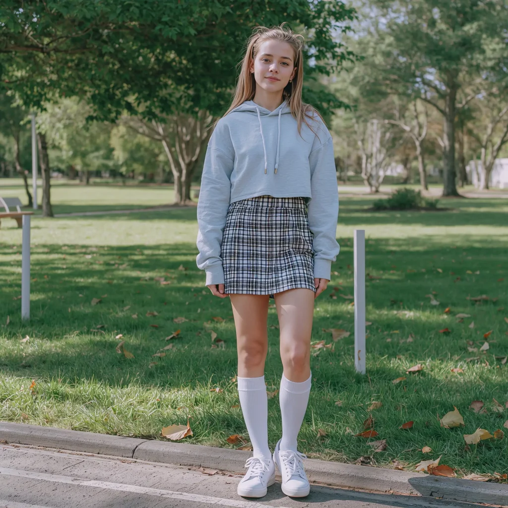 The mini skirt and cropped hoodie combination is giving major Y2K vibes, and honestly, I’m living for this nostalgic trend comeback.