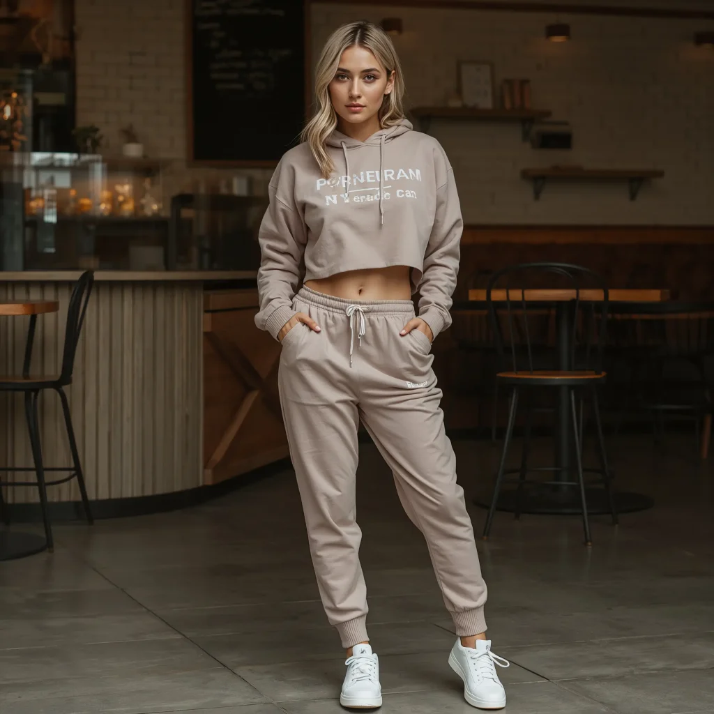 Look for joggers with a tapered leg and good elastic quality. The cropped hoodie should hit right at your natural waistline when paired with the high-rise joggers. This creates a seamless, elongated silhouette that’s incredibly flattering.