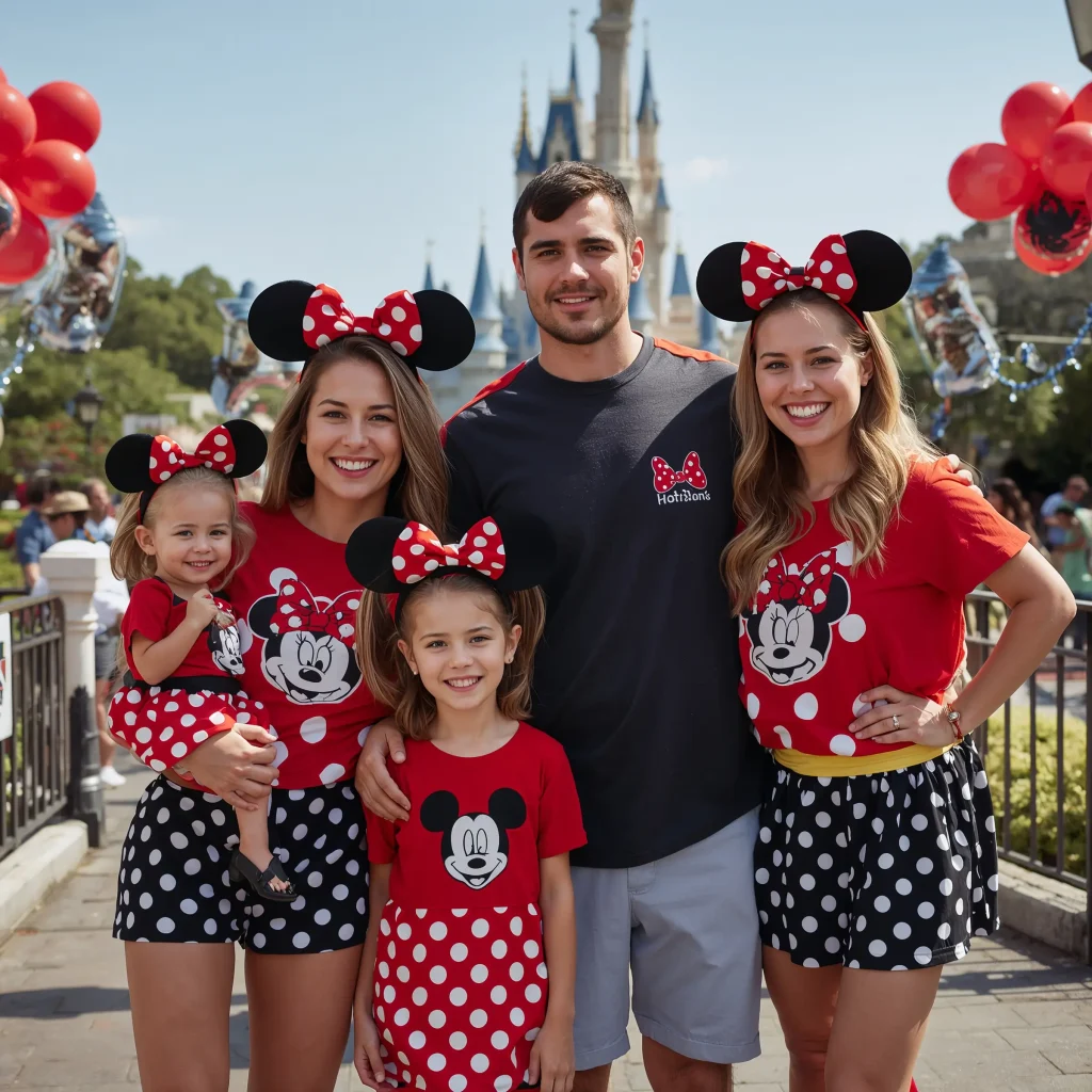 I remember my first family Disney trip where we went full Mickey mode. My husband wore a black shirt with red shorts, I rocked a red polka dot dress, and our kids had those adorable Mickey ear hoodies. The best part? We didn’t look like walking billboards.