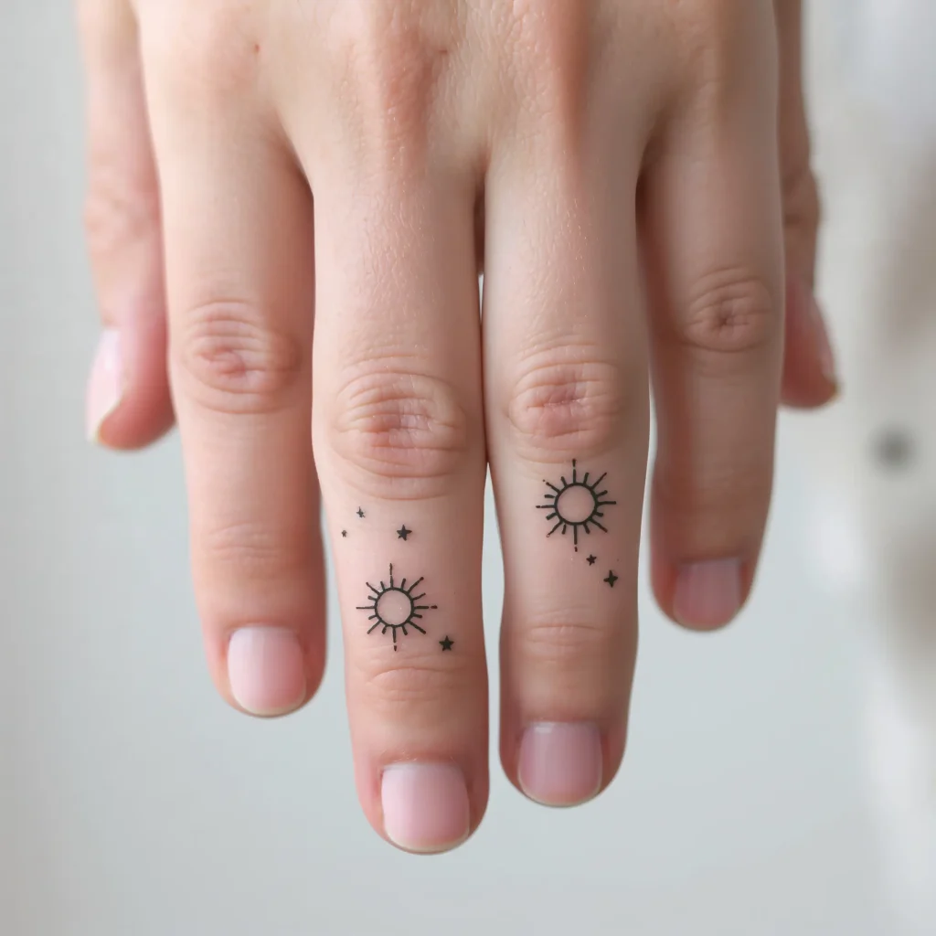 The placement possibilities are endless. You could put the sun on one finger and stars on another, creating this cosmic story across your hand. Or go for a tiny sun with a trailing star, like a miniature solar system on your finger.
