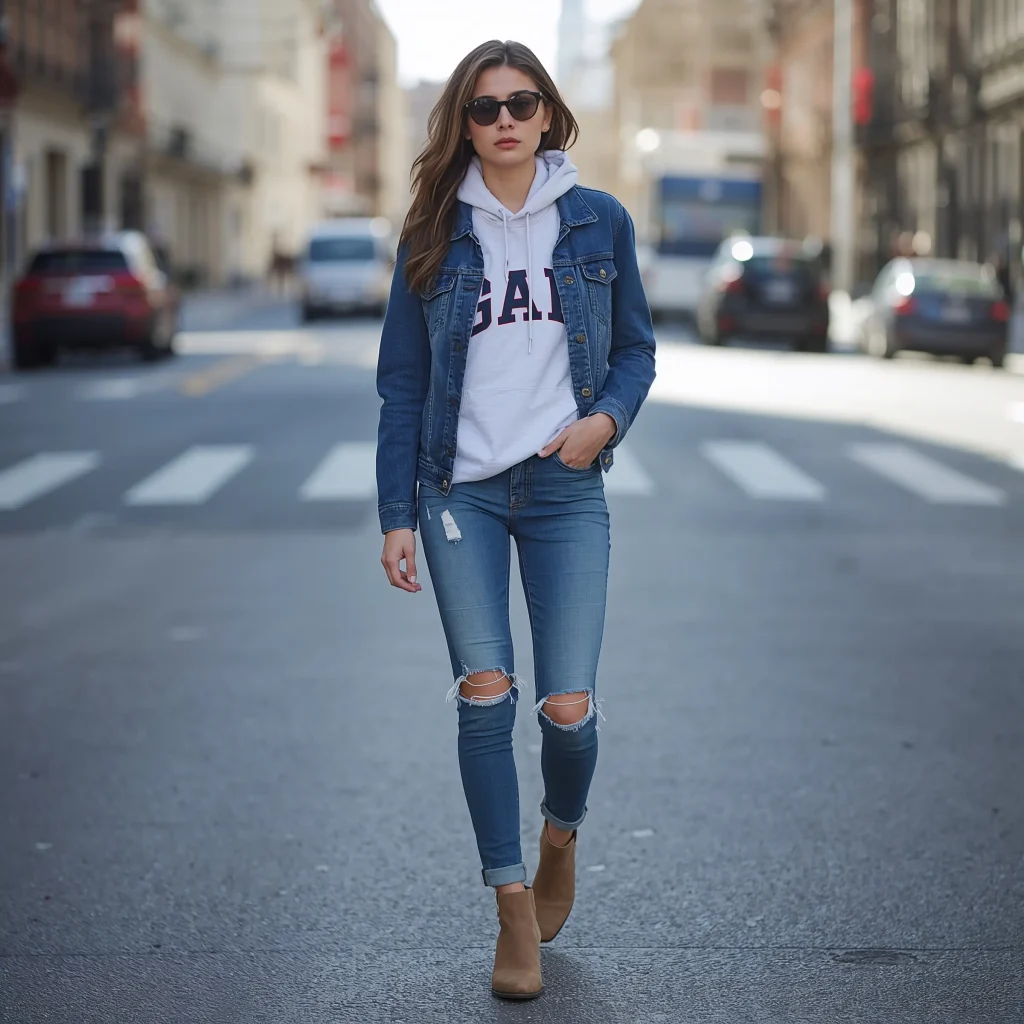 Here’s where things get interesting. Layering a denim jacket over your Gap hoodie creates depth and dimension that a single layer just can’t achieve. Plus, it’s practical for those weird weather days when you can’t decide if you need a jacket or not.