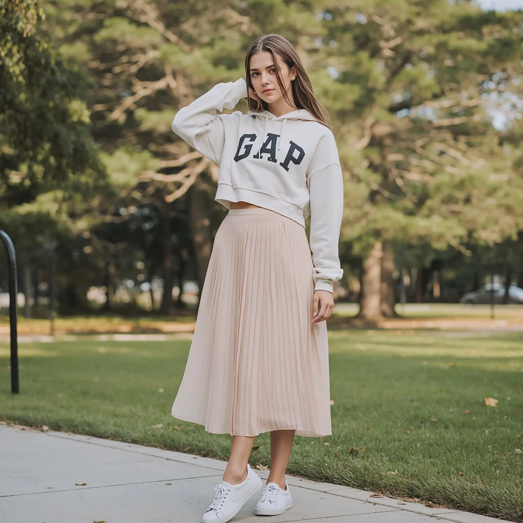 Who says hoodies can’t be feminine? Pairing your Gap hoodie with a skirt creates this amazing high-low mix that fashion editors absolutely eat up. It’s unexpected, it’s fresh, and it’s ridiculously comfortable.