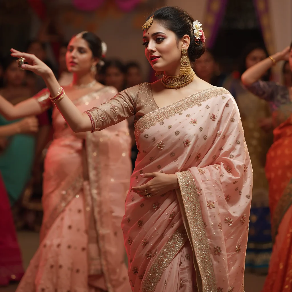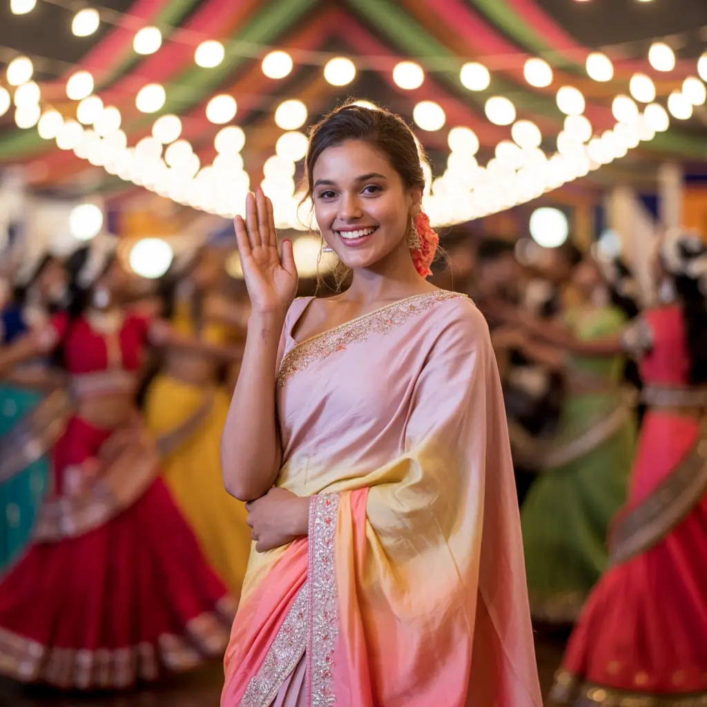 The trick with sarees for Garba? You need to drape them slightly shorter than usual. Nobody wants to trip over their pallu while doing those energetic steps. I usually go for the Gujarati style draping – it’s dance-friendly and looks incredibly graceful.
