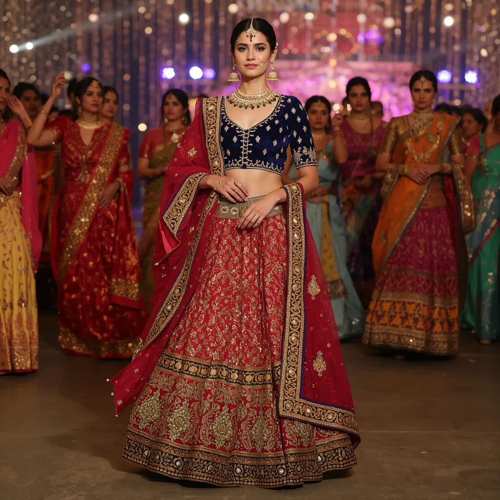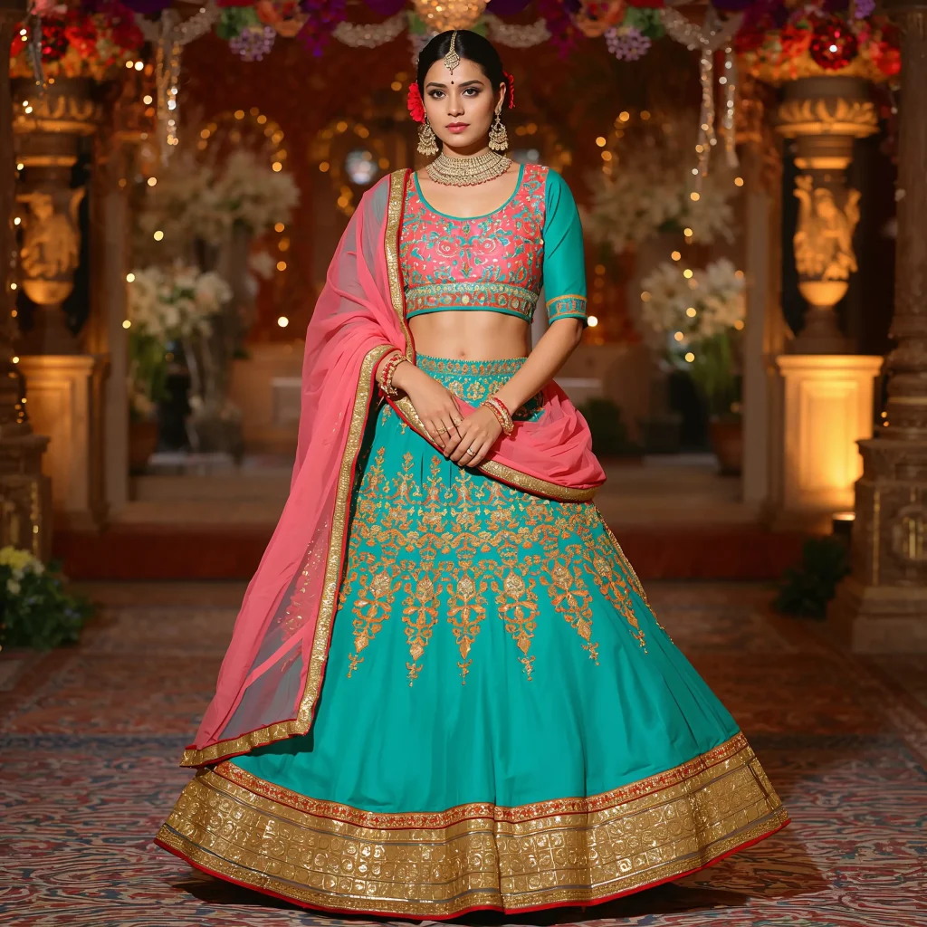 My favorite combination? A deep purple Banarasi lehenga with a mustard yellow blouse. Sounds crazy, but trust the process – these unexpected color pairings make you stand out in the best way possible.