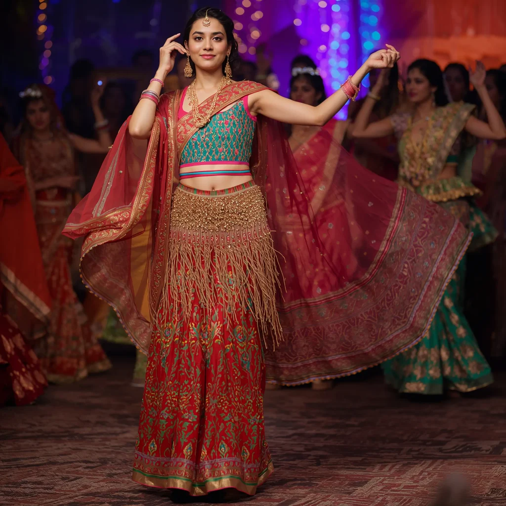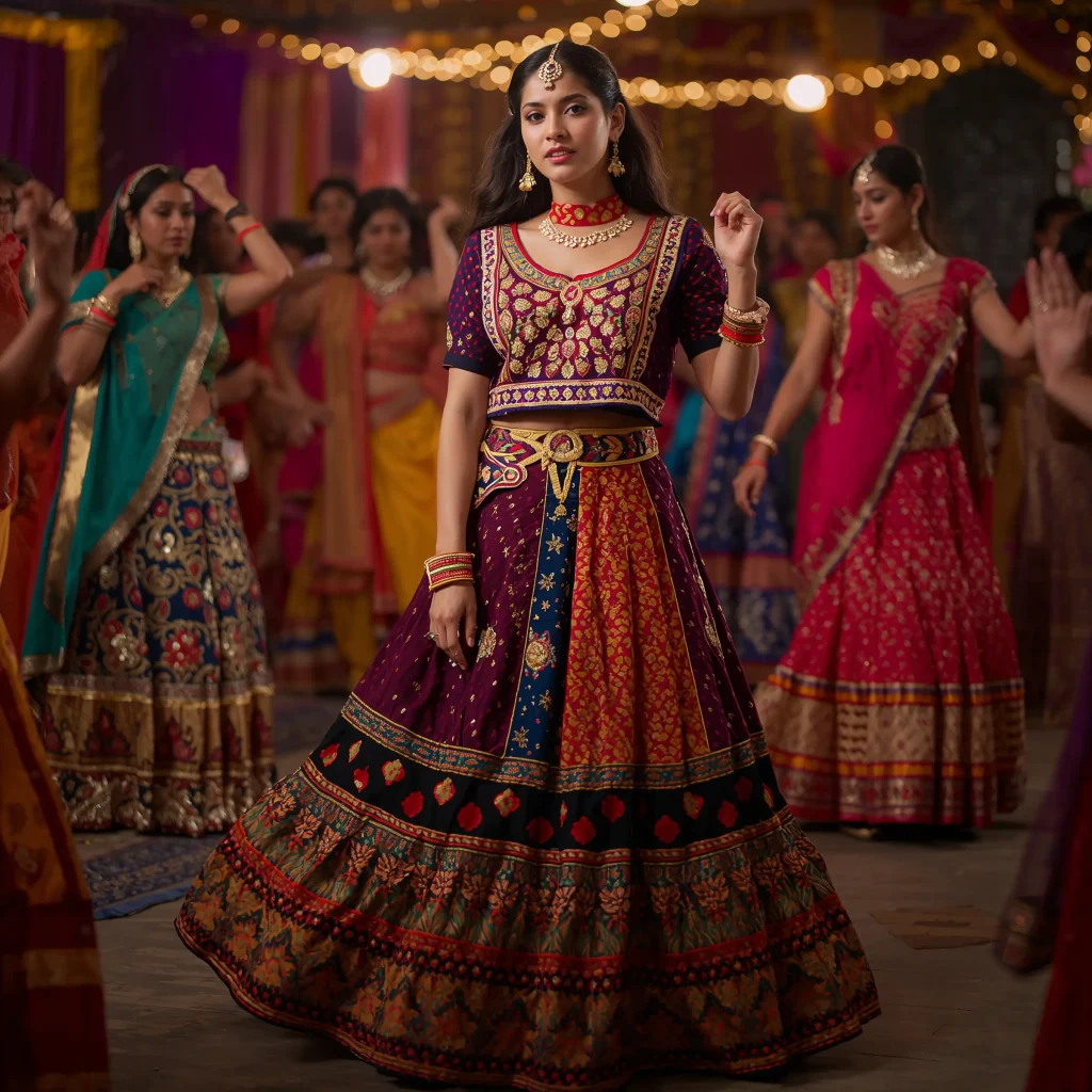 What makes this combo brilliant? You can mix and match pieces from your existing wardrobe. That embroidered crop top from your cousin’s wedding? Pair it with a flowy skirt, and boom – instant Garba outfit!