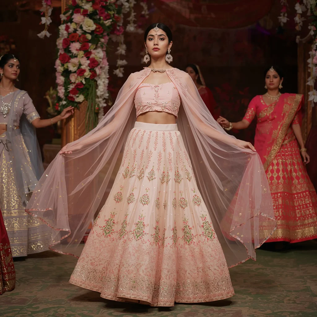 Capes are having a major moment, and honestly? I’m not mad about it! The cape-style lehenga brings this ethereal quality to your Garba look that regular outfits just can’t match.