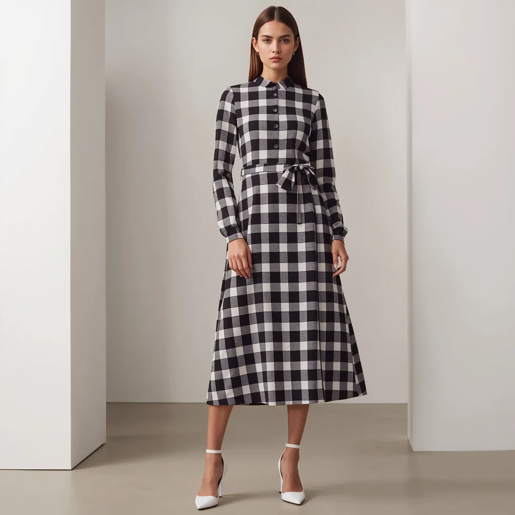 Think of your gingham dress as a jumper or pinafore base. Layer different textures underneath – ribbed turtlenecks, smooth thermal tops, or even thin wool sweaters. Each creates a different silhouette and warmth level.