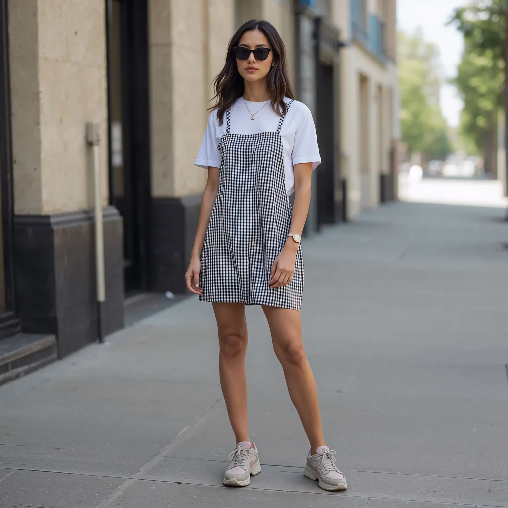 Add personality through unexpected layering. Wear a graphic tee underneath, leaving the dress unbuttoned as a duster. Or layer a mesh top over your gingham dress for edgy transparency play.