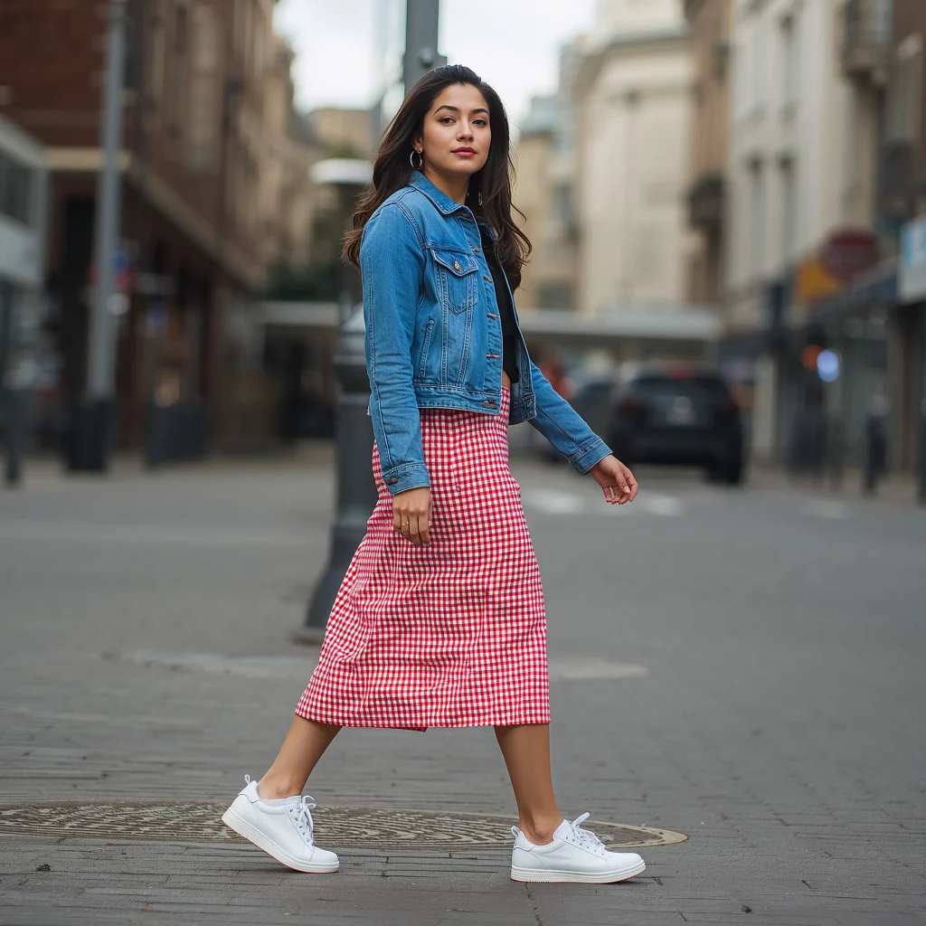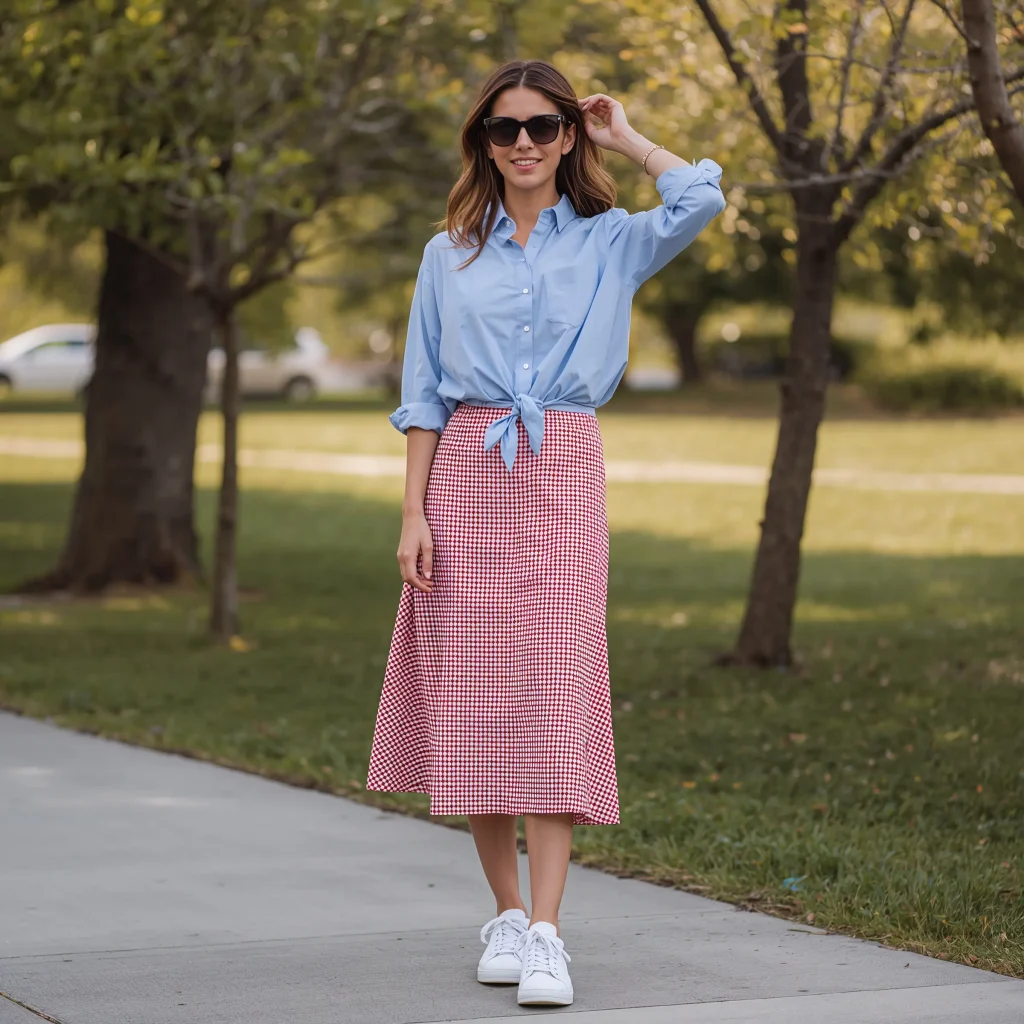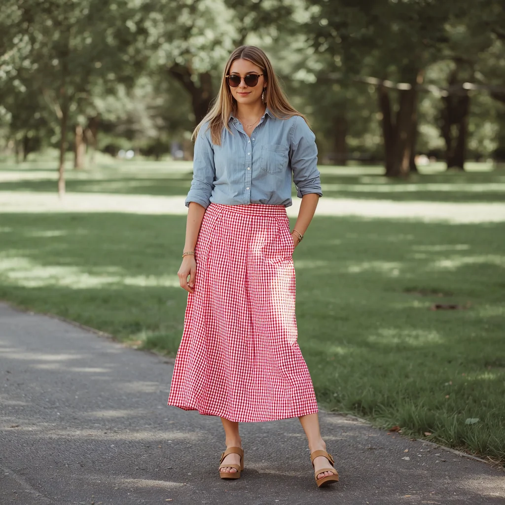 My favorite graphic tee features a vintage rock band logo, and when I tuck it into my red gingham skirt? Instant conversation starter. The key is choosing graphics that complement, not compete with the busy pattern.
