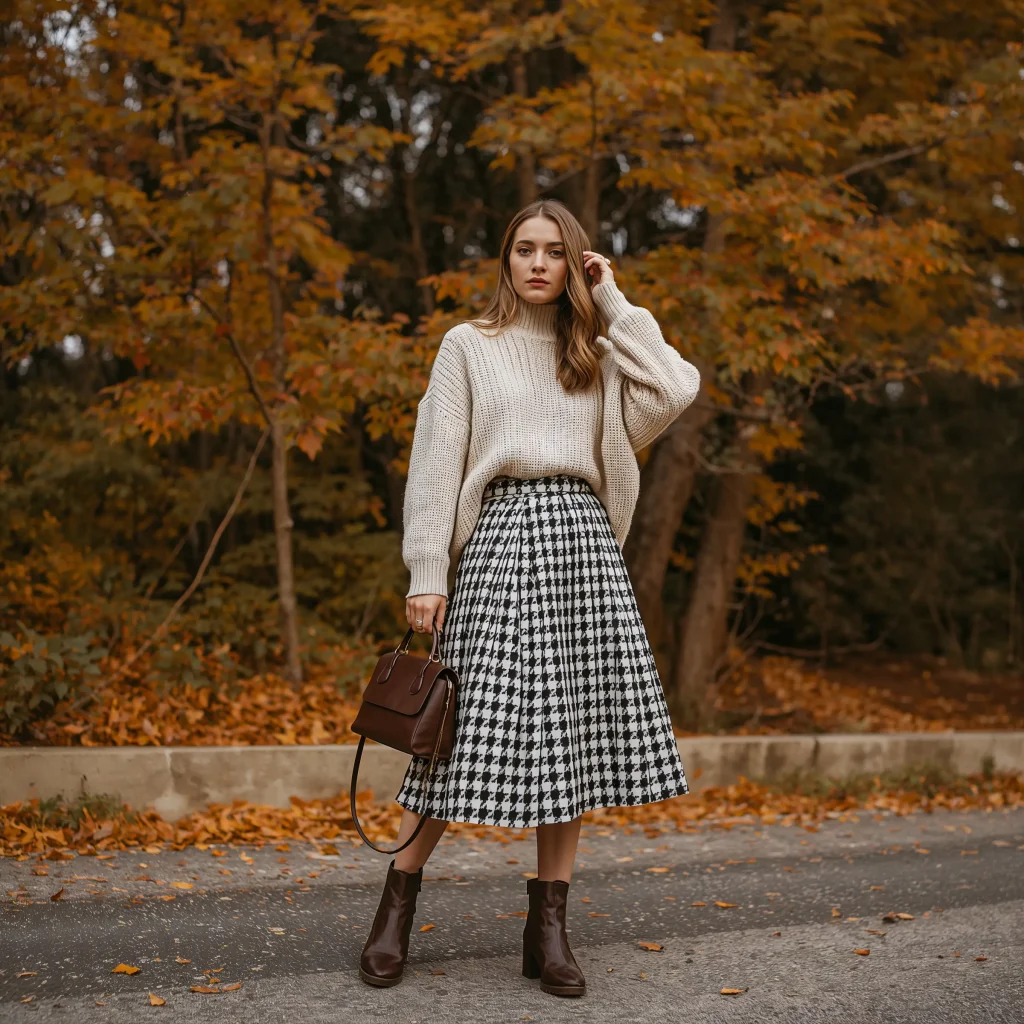 Last fall, I practically lived in this combination. The beauty of it? You can literally roll out of bed, throw on these pieces, and look like you spent an hour getting ready. The pleats add structure and movement, while the oversized sweater says “I’m approachable and definitely have snacks in my purse.”