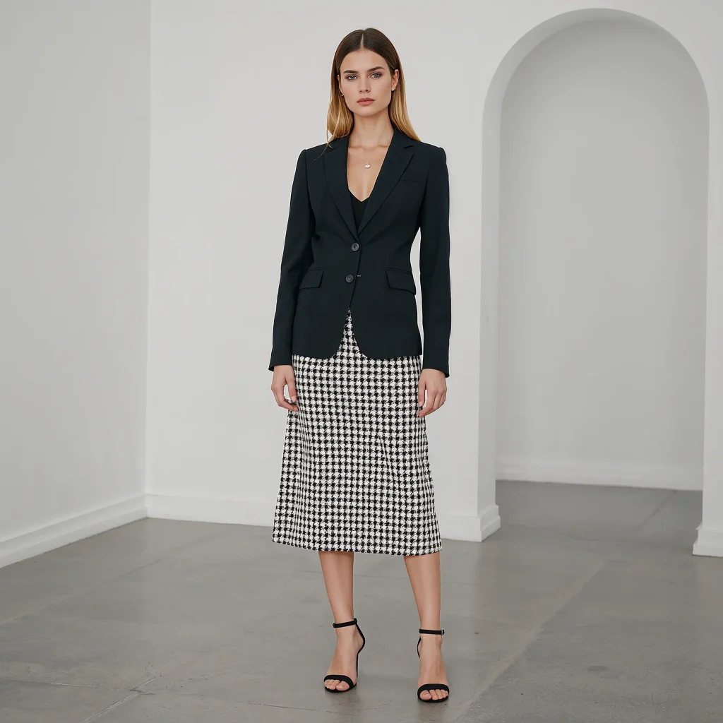 - Matching blazer and skirt = instant suit vibes with pattern interest