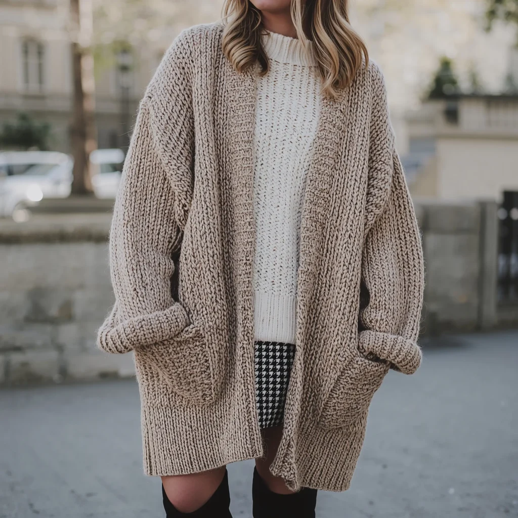 My chunky knit cardigan has become my most-worn piece since discovering this combination. The textural contrast between the knit and the crisp cotton gingham creates visual interest without trying too hard.